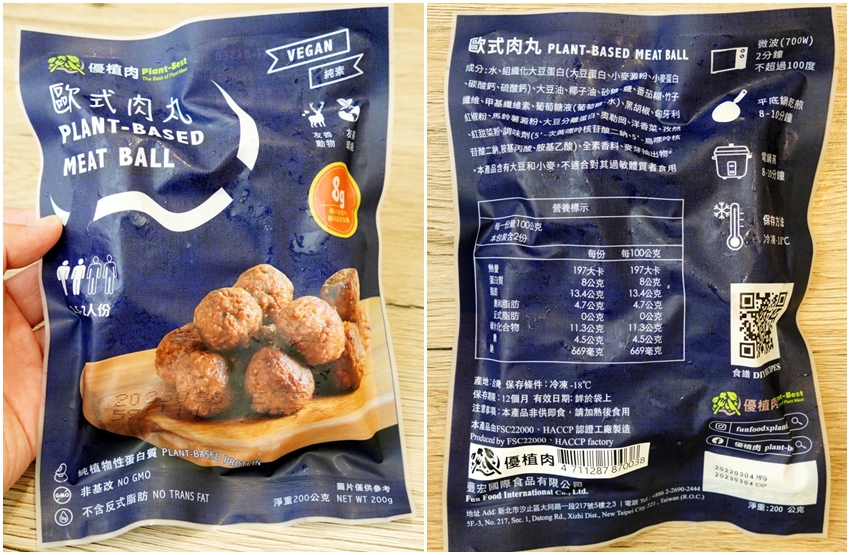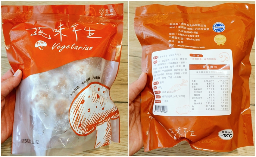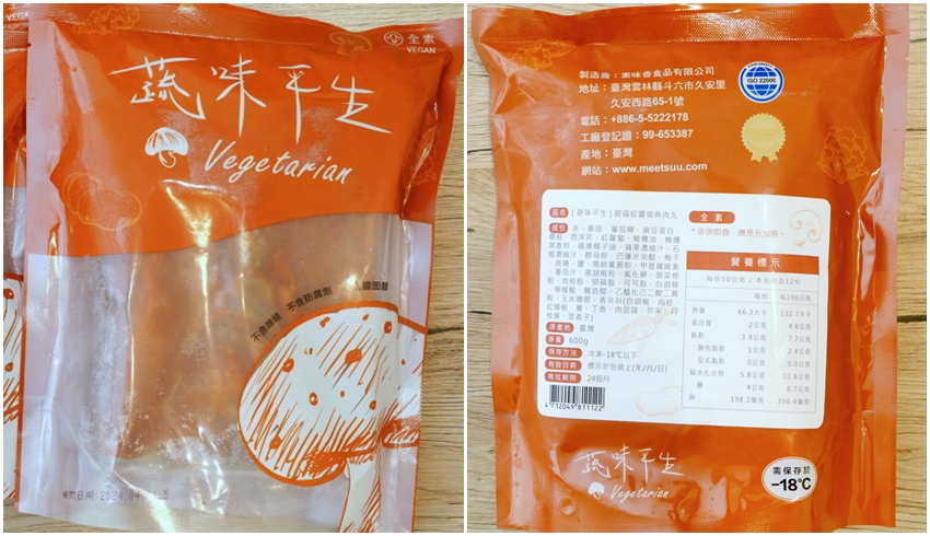 1.採用100%非基改植物蛋白及植物性調料,不含反式脂肪、防腐劑、五辛等,更是友善環境、友善動物的植物肉丸。