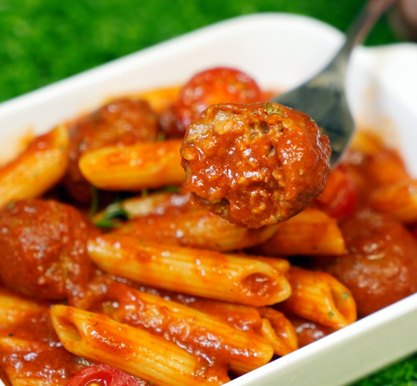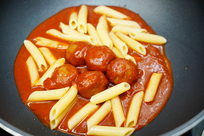 ▼將紅醬瑞典肉丸倒入鍋中,再加入燙熟後的義大利麵,攪拌至滾燙均勻即可起鍋~~