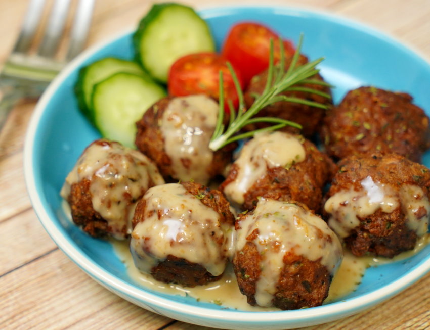 ▼簡單淋上自製胡麻醬,看起來更加可口~~就跟在外頭餐廳吃瑞典肉丸一樣,建議淋點醬料上去提味風味更佳!搭配胡麻醬吃起來還蠻順口的,鹹度適中、帶有微微炭燻香氣,加上組織蛋白讓口感更加緊實有嚼感,不說的話完全吃不出在吃素丸子,而且沒有膽固醇、反式脂肪,低脂又減納,吃起來也更讓人安心不少~~搭配草莓醬也很合拍!