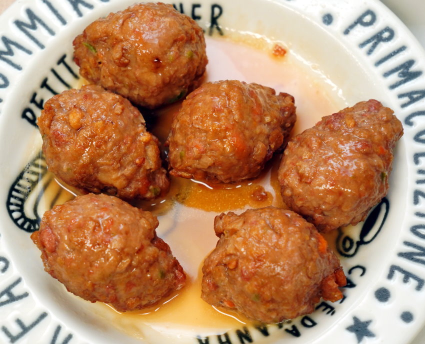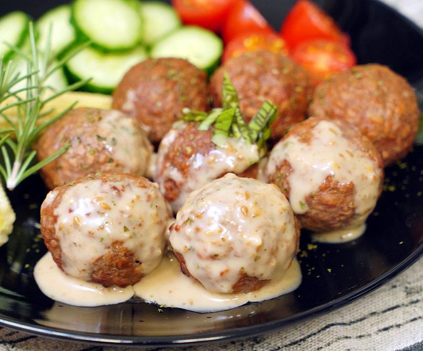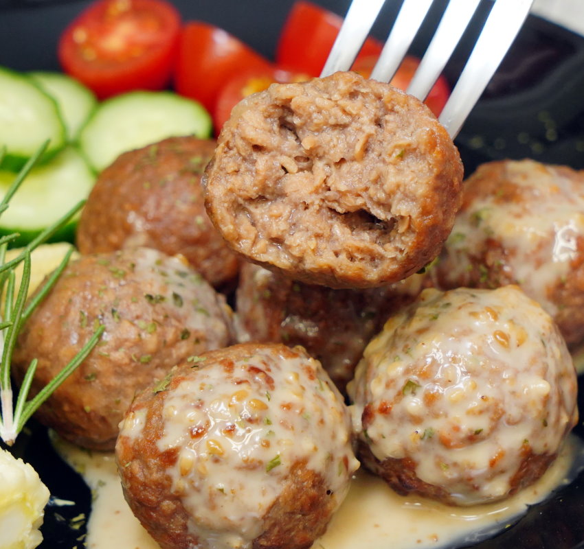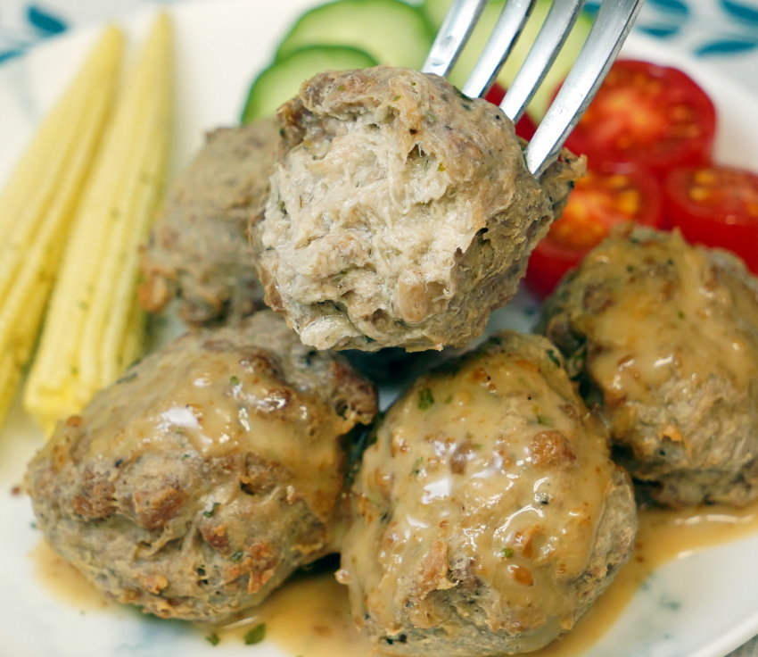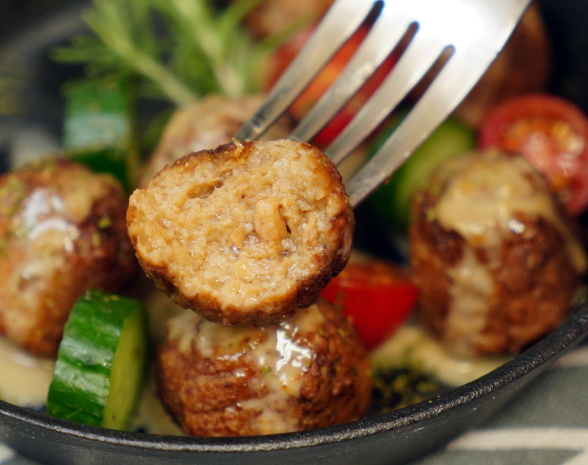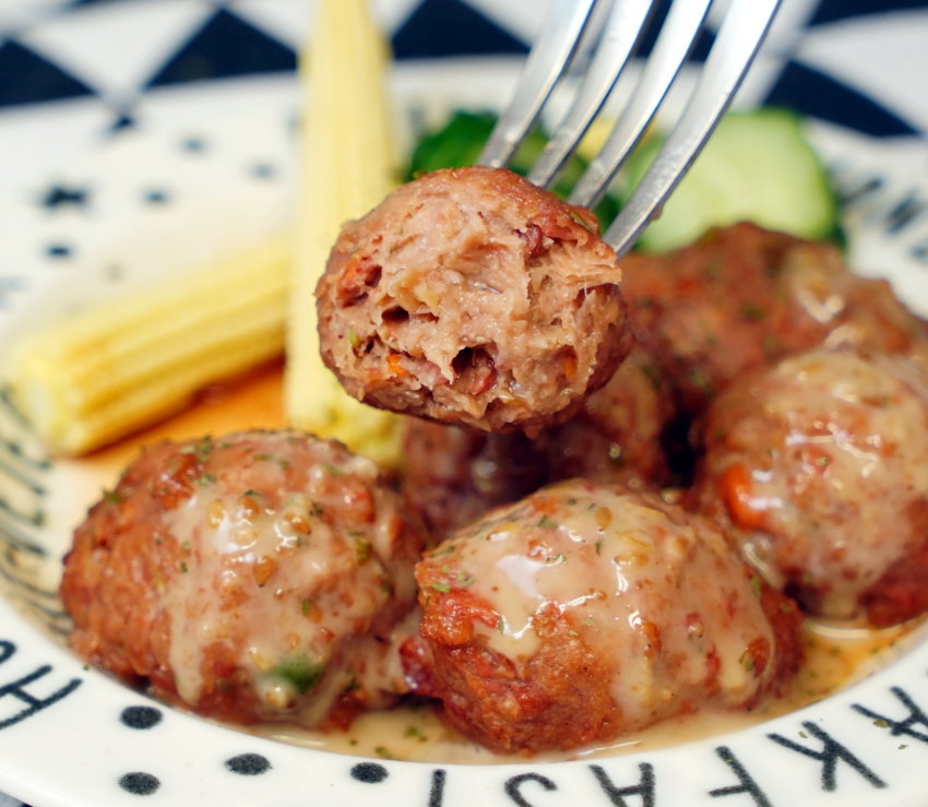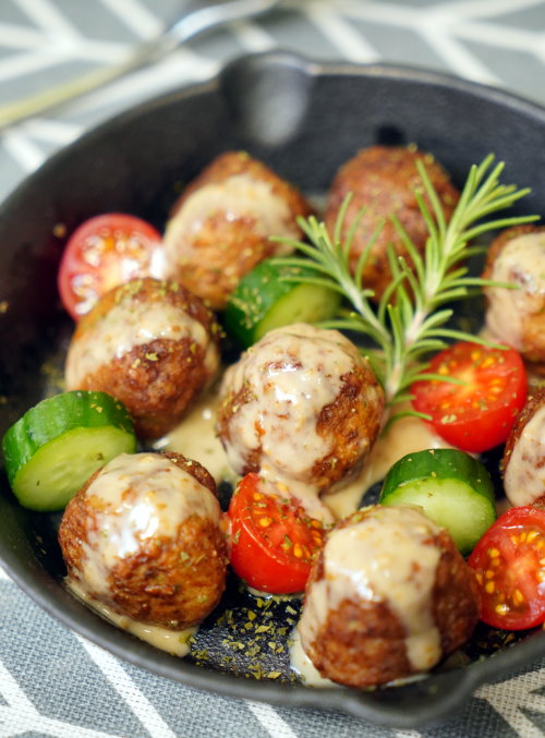 ▼淋上自製胡麻醬後看起來更誘人啦!這款歐式肉丸吃起來有滿滿的香料香氣,口味濃重,不太需要沾醬也很夠味,鹹度較高一點,適合重口味的朋友享用!