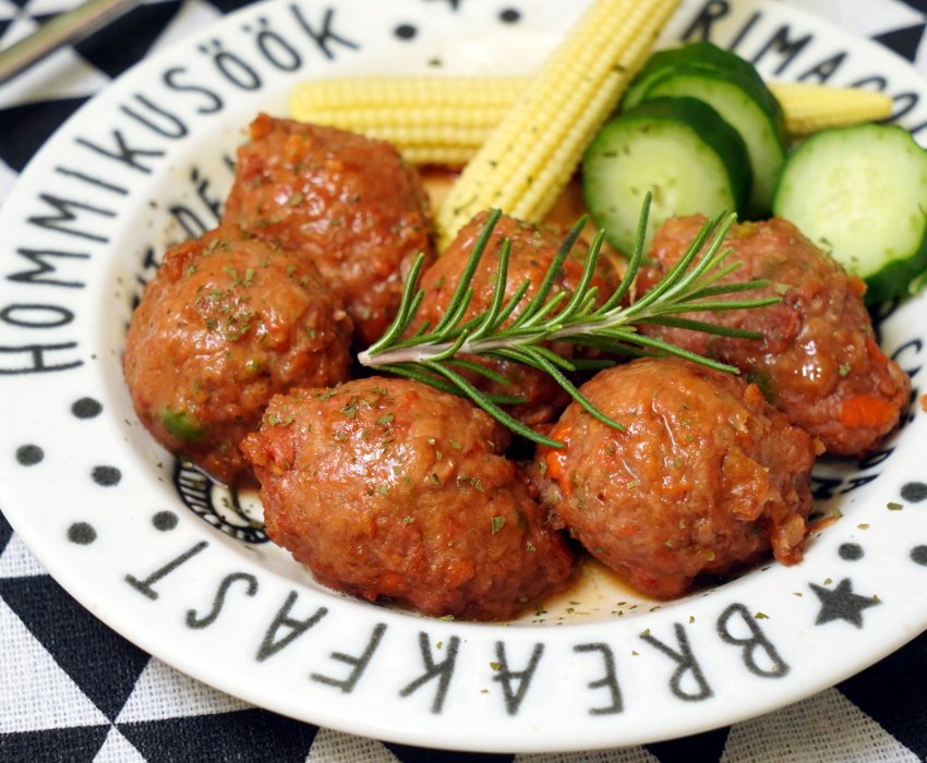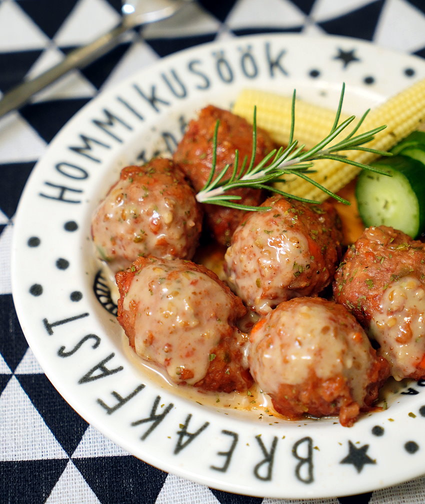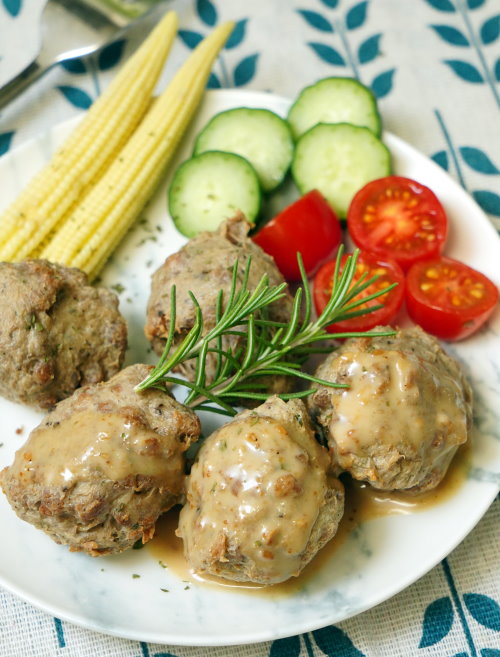▼盛盤後簡單搭配玉米筍、黃瓜、迷迭香、洋香菜葉即可~~看起來怎麼有點像紅燒獅子頭的錯覺(笑)!