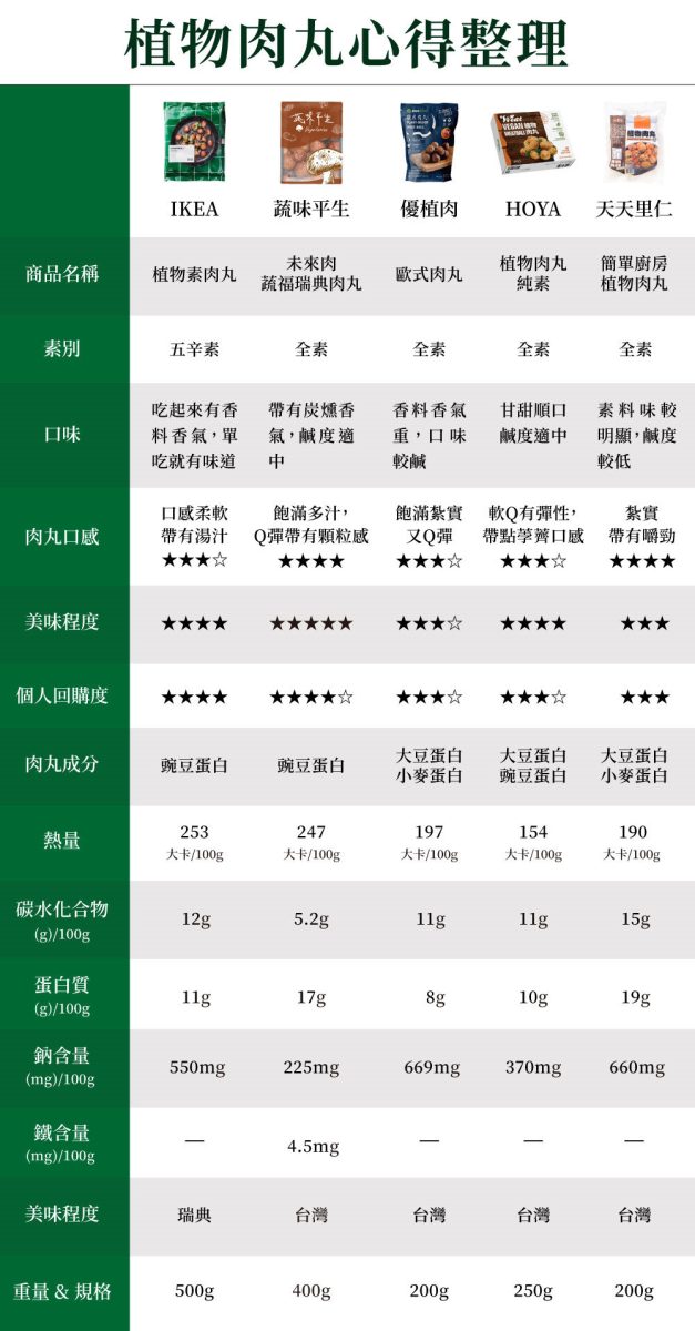 綜合以上試吃,就這五間植物肉丸品牌來說,我們心目中會想回購的排名分別為蔬味平生>IKEA>HOYA>優植肉>天天里仁,其中蔬味平生是兼具口感與健康,吃起來也不容易脹氣,低鈉高蛋白又能攝取膳食纖維,吃起來清爽飽足又能吃到均衡的營養;IKEA則是單吃就很美味,只是口感偏軟,我們還是比較喜歡有點嚼感的丸子,就比較可惜一些~~HOYA的口感、調味都還不錯,可惜鈉含量稍高一些!優植肉帶有濃郁的辛香料氣息,單吃就很夠味,只是吃久了會覺得口味有點過於鹹重,比較沒辦法搭配太多料理!天天里仁則是口感過於紮實,味道比較偏傳統素料的風味,可能要做成其他料理比較適合~~以上心得提供給大家,有興趣的朋友不妨可以品嚐看看!