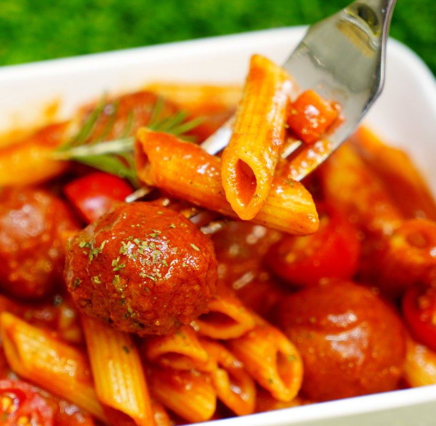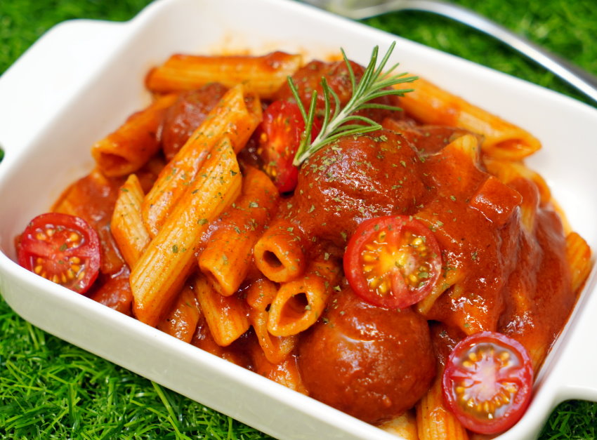 ▼美味的紅醬瑞典肉丸義大利麵上桌啦~~整個過程只要10分鐘,稍微講究一點的朋友可以像我們一樣加入小番茄,再撒上洋香菜葉、擺上迷迭香就完成啦!