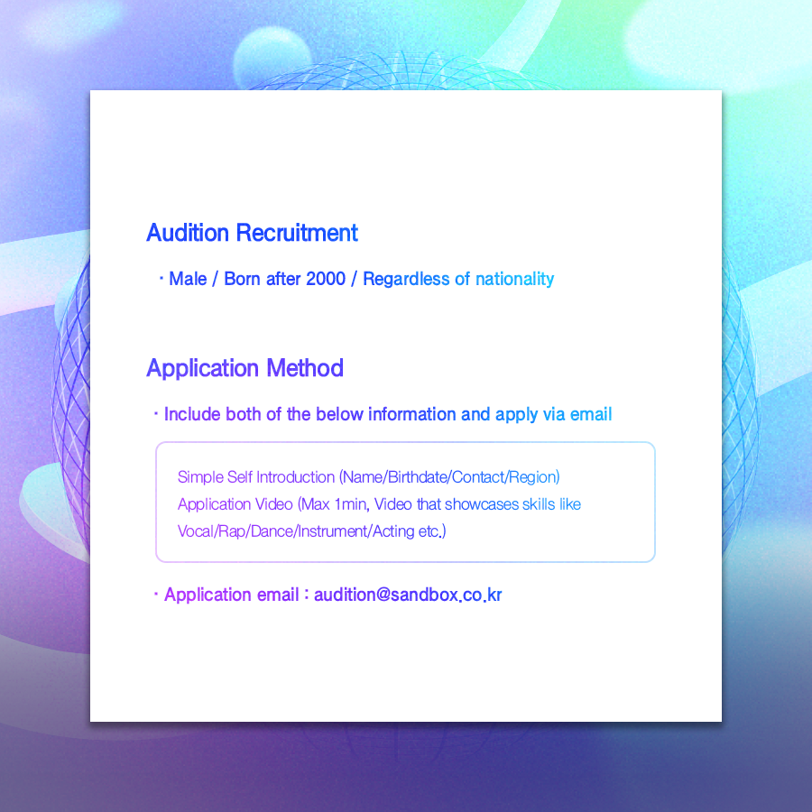 第一階段海選申請可向SANDBOX官方海選信箱(audition@sandbox.co.kr)提交,多詳情可以在SANDBOX官網(www.sandbox.co.kr)的公告中查看