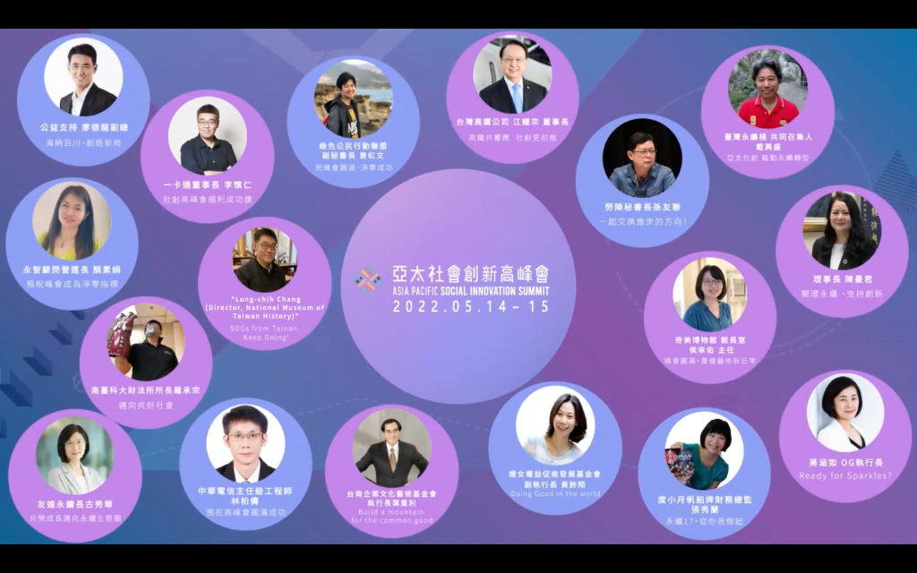 「2022亞太社會創新高峰會」2022年5月14至15日原定於台南實體舉辦,因應疫情,改採講者虛實整合與觀眾全線上參與的方式進行,本屆峰會主題為「重健亞洲」,邀請國內外關注社會創新議題的專業人士,共同聚焦在被疫情改變後的新日常,並以淨零碳排、永續環境之新思維思考如何打造宜居而健康的生活環境。