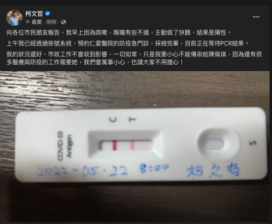 今(22日)北市長柯文哲早上快篩陽,目前等待PCR篩檢結果中。 柯文哲也在臉書PO快篩陽的圖片,因早上因為咳嗽,喉嚨有些不適,主動做了快篩,結果是陽性。