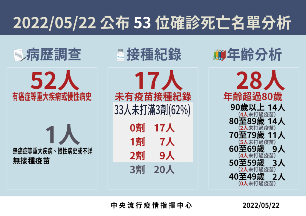 指揮中心指出,今日新增53例本土病例死亡個案,為23例男性、30例女性,年齡介於40多歲至90歲以上,皆屬重度感染個案、52例具慢性病史、17例無疫苗接種。確診日介於今(2022)年5月4日至5月19日,死亡日期介於5月10日至5月20日