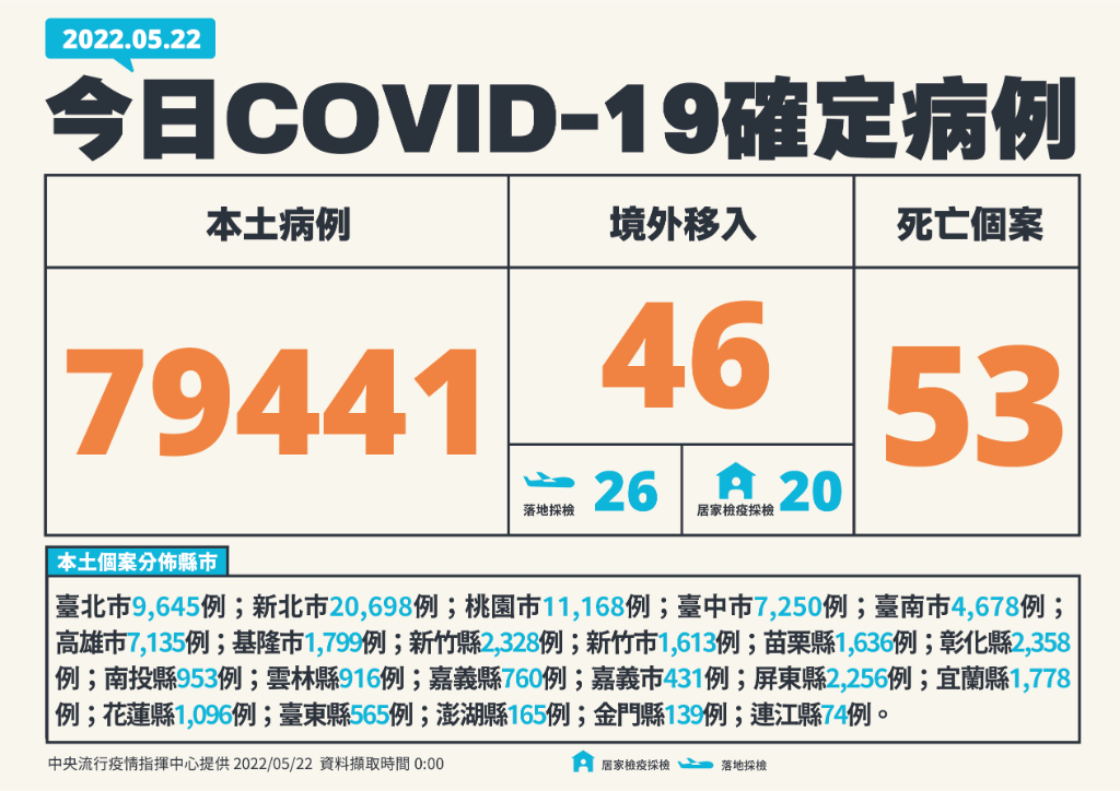 今(22)日公布國內新增79,487例COVID-19確定病例,分別為79,441例本土個案及46例