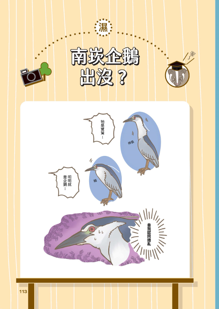 二〇一八年,有人通報在桃園南崁溪邊出現一隻「企鵝」!這可不得了了,警察火速到場,一把將這隻「企鵝」抓走。野鳥協會也趕快到場確認,這才發現只是一隻倒楣的夜鷺……「這裡是南崁,不是南極啦!」這個故事已經成為賞鳥人之間廣為流傳的笑話,時至今日,大家還是會戲稱夜鷺為「南崁企鵝」。