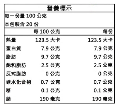 ①標示每一份及每100 公克( 或每100 毫升)熱量與營養素含量。