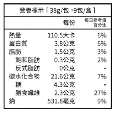 ②標示每一份熱量與營養素含量及每日參考值所占百分比。