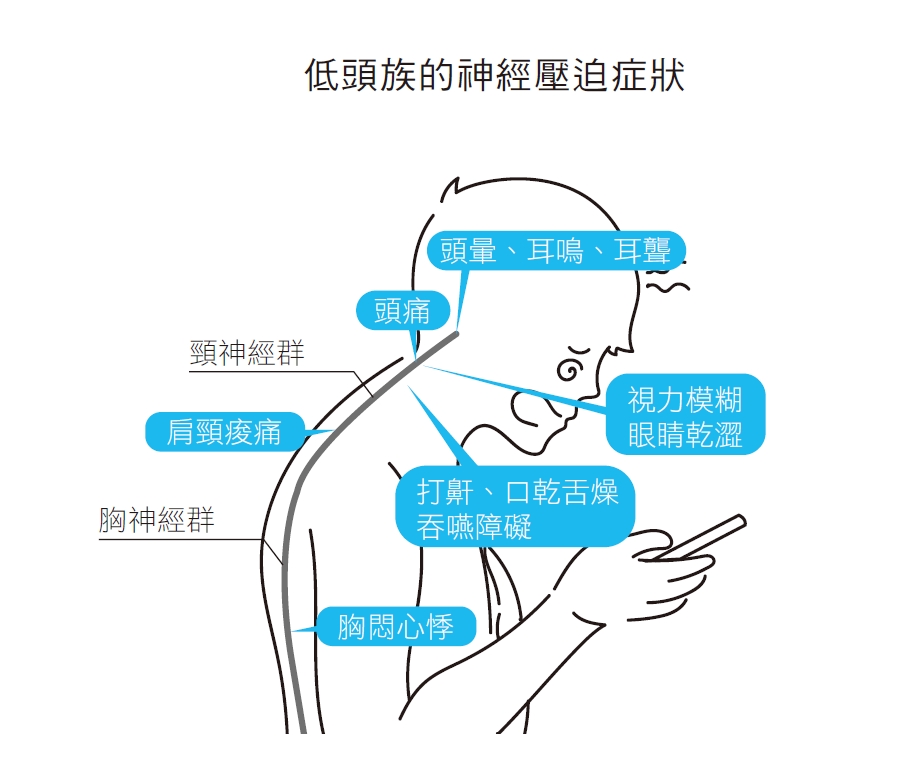 ▲ 低頭族的神經壓迫症狀。(圖:新自然主義)