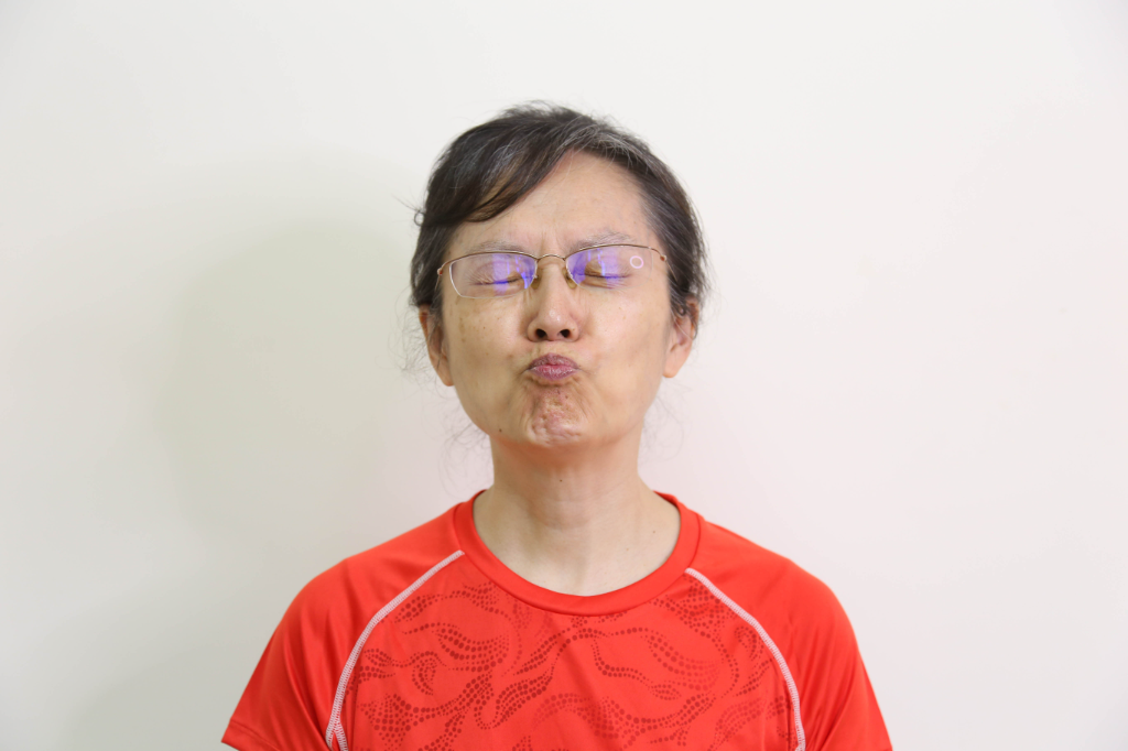 (3)然後,頭回到正面,用力閉上眼睛,微微嘟嘴,停留3秒,保持自然呼吸;之後頭部回正,臉部放輕鬆。