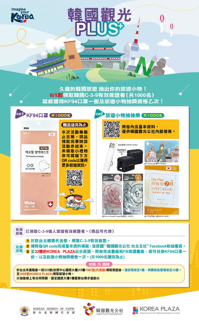 而至駐台北韓國代表部(台北世貿中心國貿大樓15樓)領取訪韓觀光簽證的民眾,在領完簽證後,到同一樓的32樓來訪韓國觀光公社KOREA PLAZA,亦能夠透過人人皆有獎的抽獎活動,抽出屬於你的旅遊小物!獎品包含韓國七日網路吃到飽的SIM卡、萬能轉接頭、環保免電池行李秤、韓國T-MONEY卡及KAKAO FRIENDS旅行夾鏈袋,僅提供給前來領取的前1,000位領簽民眾,心動不如馬上行動!
