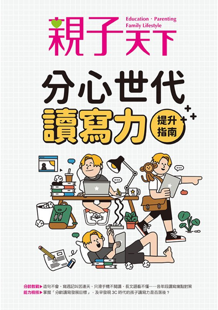 《親子天下》6月推出「分心世代 讀寫力提升指南」封面故事,採集專家、第一線老師們的分析與建議,提供5歲以上孩子分齡讀寫能力養成的策略指南,與實用的教育教養建議。