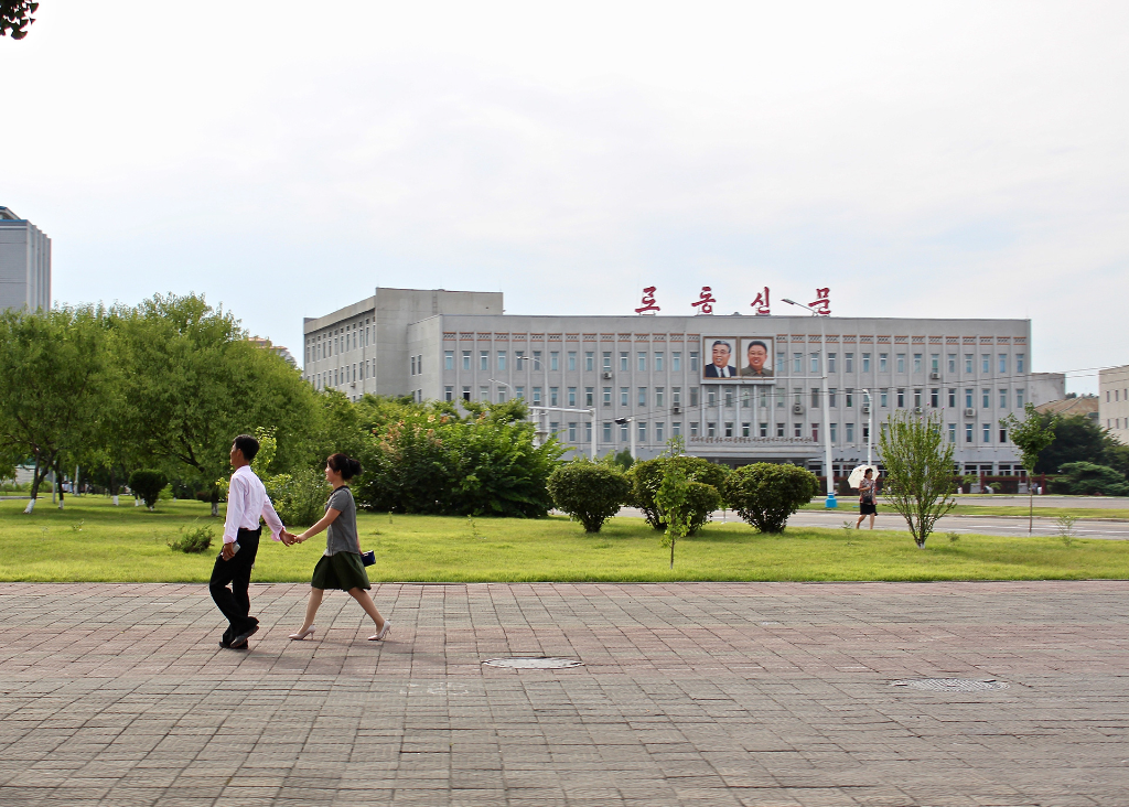 ▲ 一對年輕夫婦手牽手經過平壤《勞動新聞》日報所在的大樓。儘管老一輩看不順眼,但越來越多年輕情侶會在公眾場合表達對彼此的愛意。(圖:尖端出版)