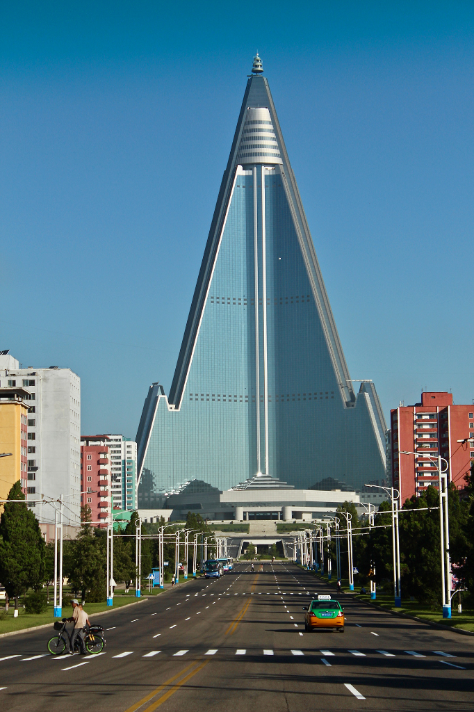 ▲柳京飯店是一座未完工的酒店建築,占據了平壤的天際線,是世界上最高的空置建築。南北韓關係在二○一八年改善期間,該酒店開始被用於夜間燈光表演的投影,顯示飄揚的朝鮮國旗和宣傳口號。維安人員總是非常迅速的阻止外國人在這裡拍照。(圖:尖端出版)