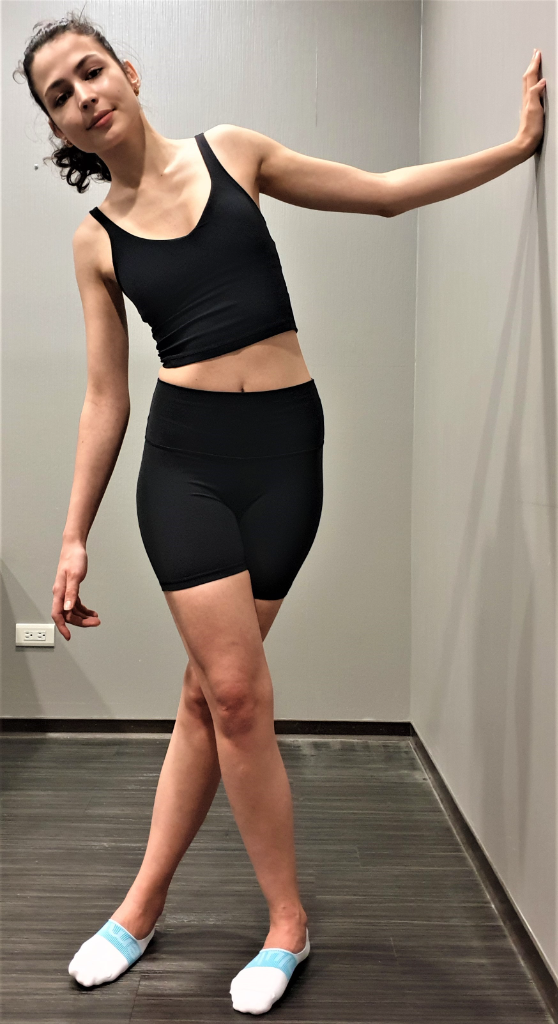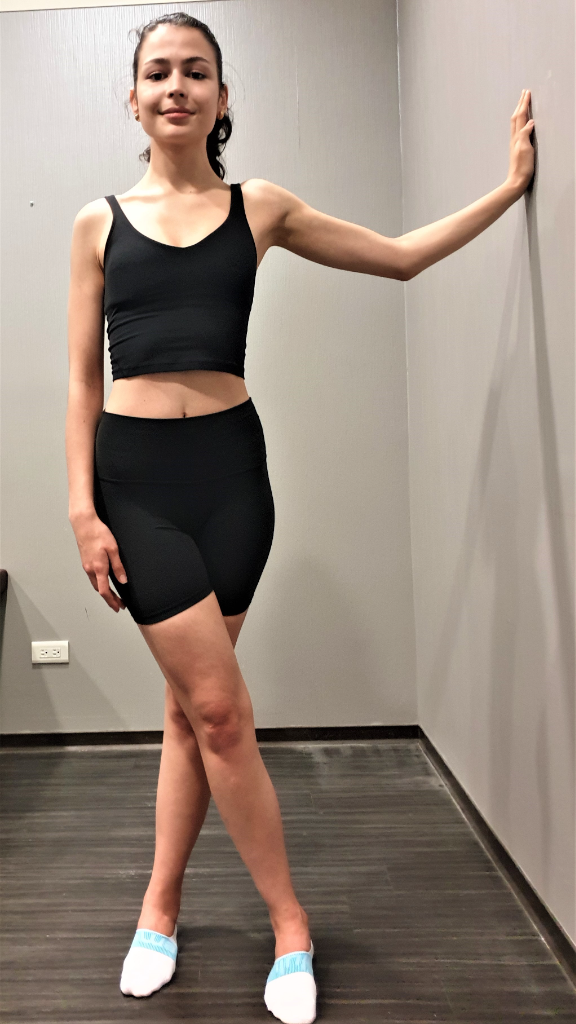 1. 患腿側朝牆,離牆一個手臂的距離,手臂自然靠牆,另一腿(健腿)交叉至前方。