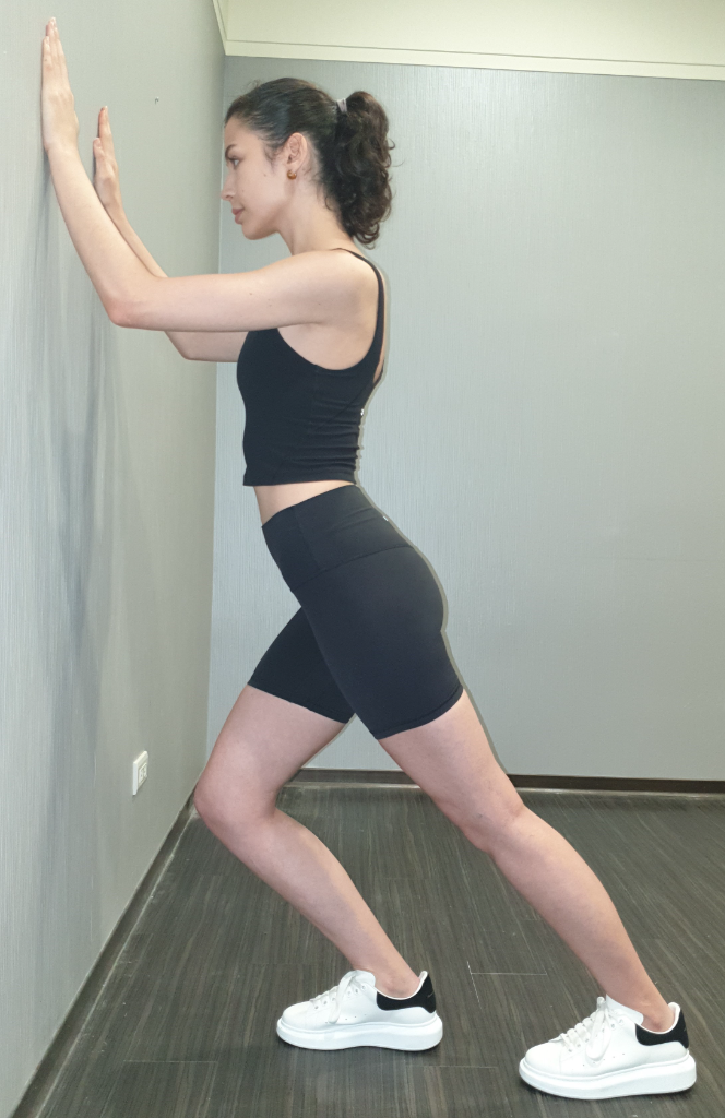 2. 身體向前斜傾,雙腳腳跟不離地,且膝關節維持伸直。此時應感到患腳後的小腿與跟腱拉緊。若想增加跟腱伸展,您也可以試圖保持患膝伸直,同時身體向前增加健腿的彎曲程度。