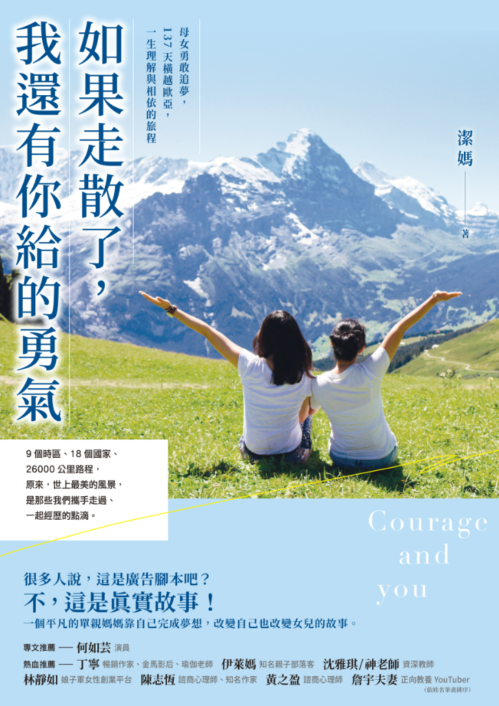 《如果走散了,我還有你給的勇氣》作者暱稱潔媽,自稱大媽。25歲失婚成為單親媽媽,獨力撫養才6個月大的女兒。咬牙打拚20餘年,在中年穩坐主管職、看似一片穩定的時刻,驚覺人生太無常、錯過太多陪伴女兒的時間,一股衝動寫了辭職信給老闆,打電話通知大三的女兒休學,出發去圓那始終沒忘卻年少時的夢想──搭火車橫越歐亞大陸,一站一站,慢慢走過沿途風景。