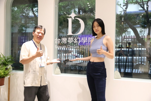 ▲ 凱渥新世代超模竺芳儀與母校崇右科大校長蕭源都,於台灣夢幻學院合影。(圖:TDI台灣夢幻學院)