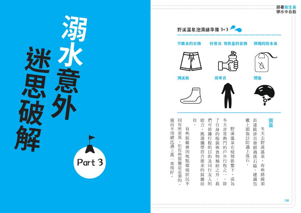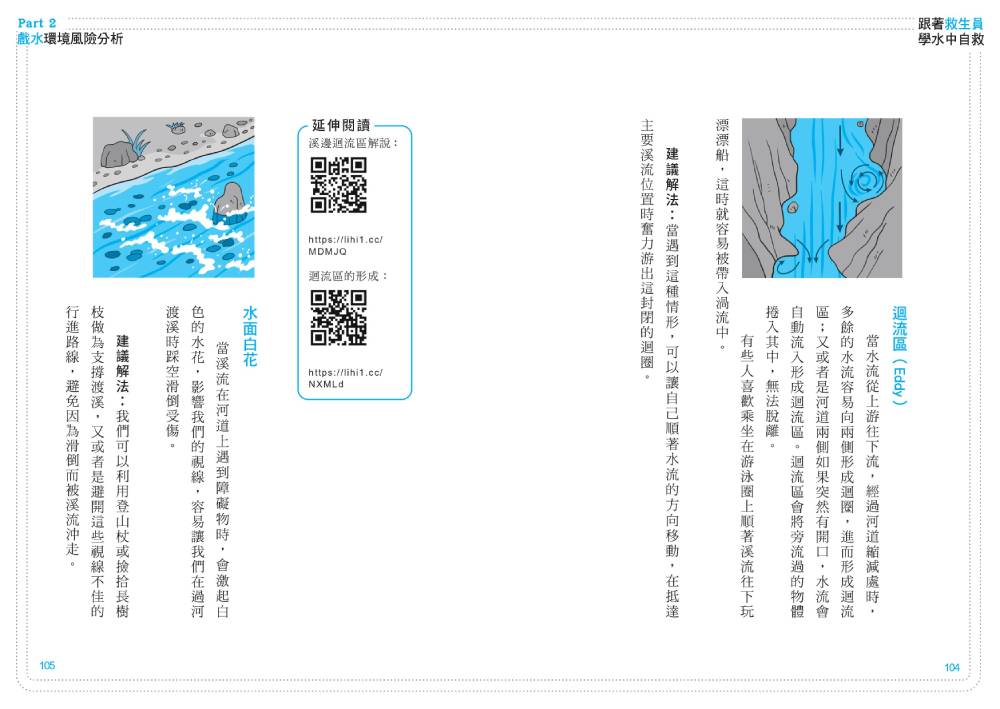 臺灣現行的游泳教育,只能讓我們在「踩得到底的游泳池」游泳,而且是在有「蛙鏡」的情形下。這樣的教育會讓大家產生自己很會游泳的錯覺,若是地點換成在溪流、海邊,水流不定,根本無法應對。張景泓提到,近幾年政府開始推動「山林解禁」、「向海致敬」等政策。身為海島子民,如果不能去親近享受我們擁有的天然資源,真的是很可惜的一件事!但若是民眾的知識跟不上,開放後可能只會徒增更多的意外發生。而《跟著救生員學水中自救》的出版正是希望建立臺灣人對水上運動的正確知識。這本書分成五大部分:「水域安全觀念建立」、「戲水環境風險分析」、「溺水意外迷思破解」、「自救求援技巧應用」、「認識水上活動風險」,教大家如何判別海邊、溪邊危險環境以及各類熱門水上活動的風險預防,更有溺水脫困的圖文影片解說,幫助大家在開心玩水的同時,也能學會遇上各種風險危機時要如何自保、甚至是協助他人脫離險境。希望所有人都能親水、不怕水、愛上水,開心玩水平安回家。