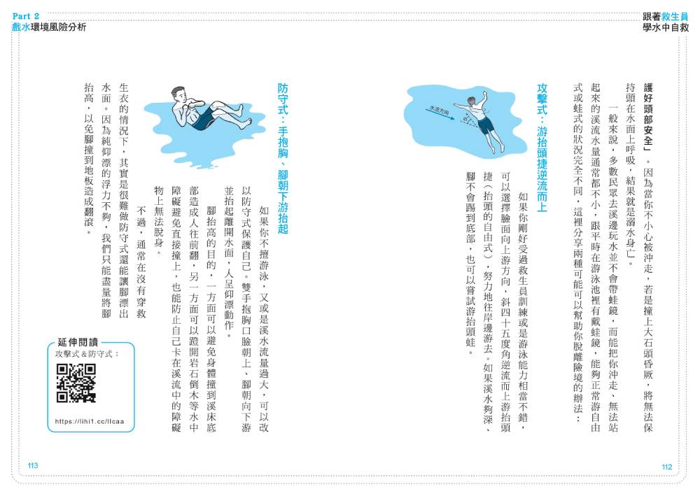 ▲ 《跟著救生員學水中自救》搭配溺水脫困的圖文影片解說,幫助大家更能清楚學習。(圖:時報出版)