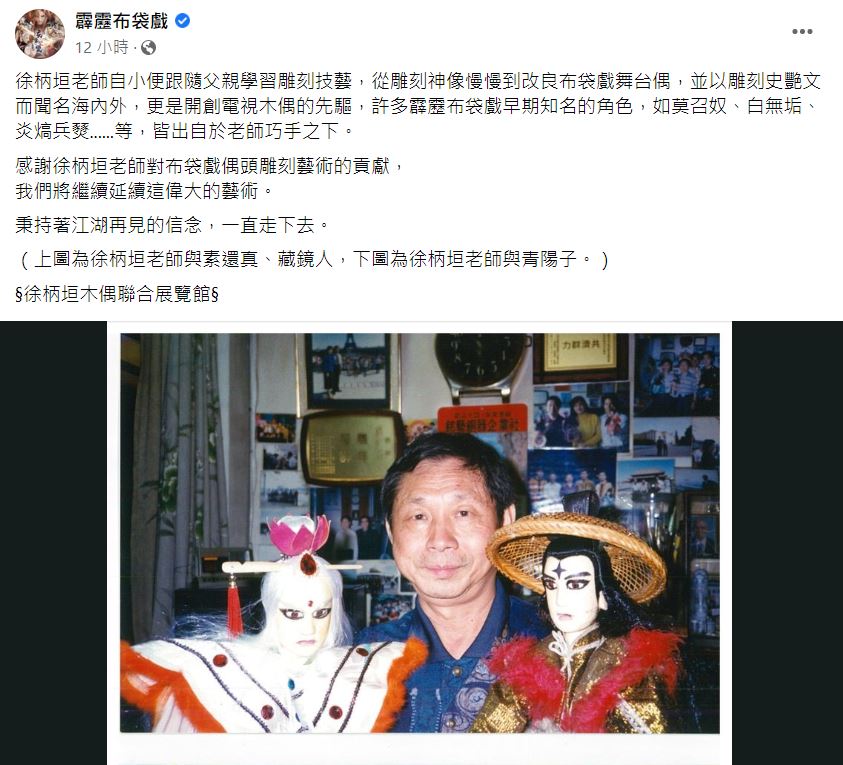 國寶大師徐柄垣過世,享壽88歲。(圖/翻攝自霹靂布袋戲臉書)