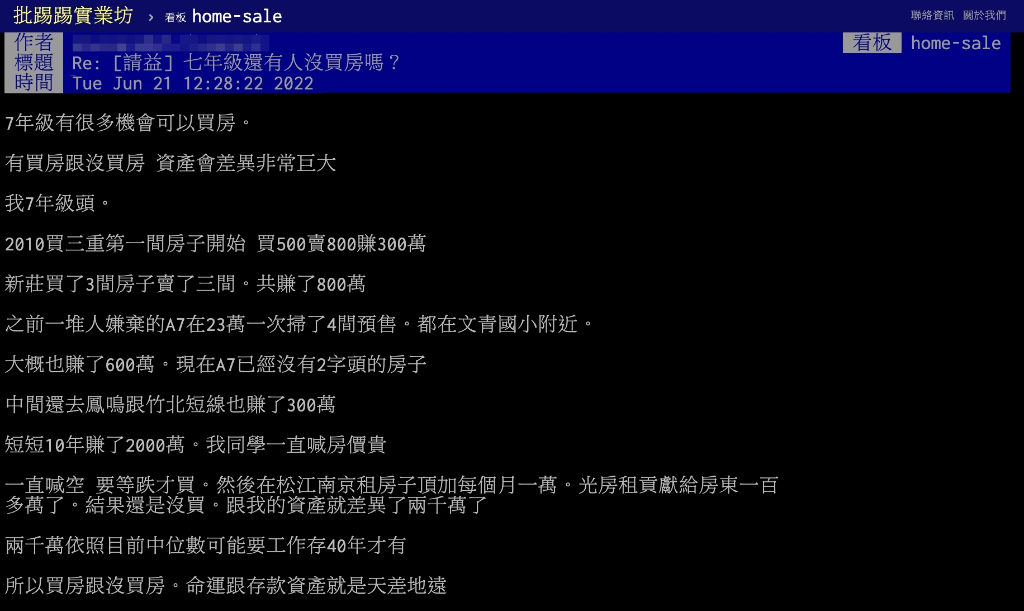 沒想到該篇貼文釣出一堆七年級生回文,其中有名網友在10年內就賺了2000萬,「7年級有很多機會可以買房,有買房跟沒買房,資產會差異非常巨大」,他表示自己是七年級頭,在2010年買了三重第一間房,500萬入手,賣800萬賺了300萬,後來新莊買了3間房也都賣掉共賺了800萬。