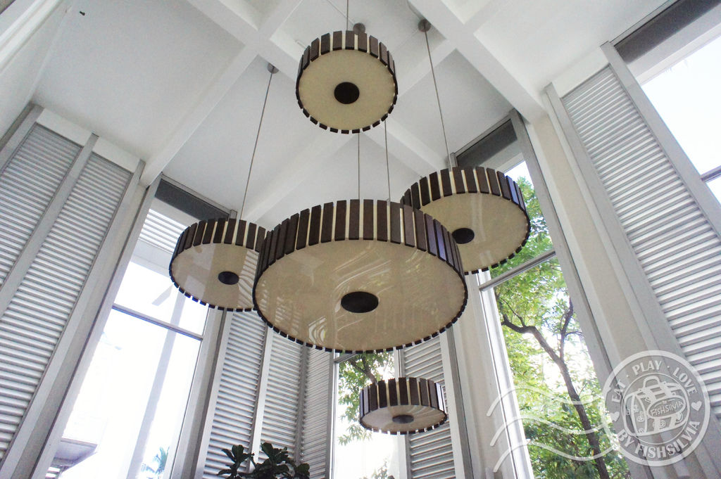 由於我們什麼事都不能做,我只好開始觀察起Lobby的細節...挑高垂吊燈飾真的蠻有設計感的,而且L型自然採光處選用落地百葉窗感覺超輕爽的啊!所以沒有冷氣好像也不會怎麼樣...