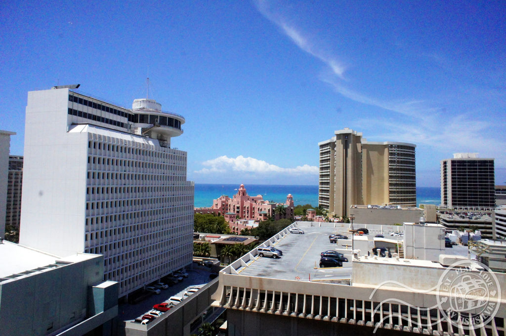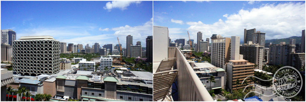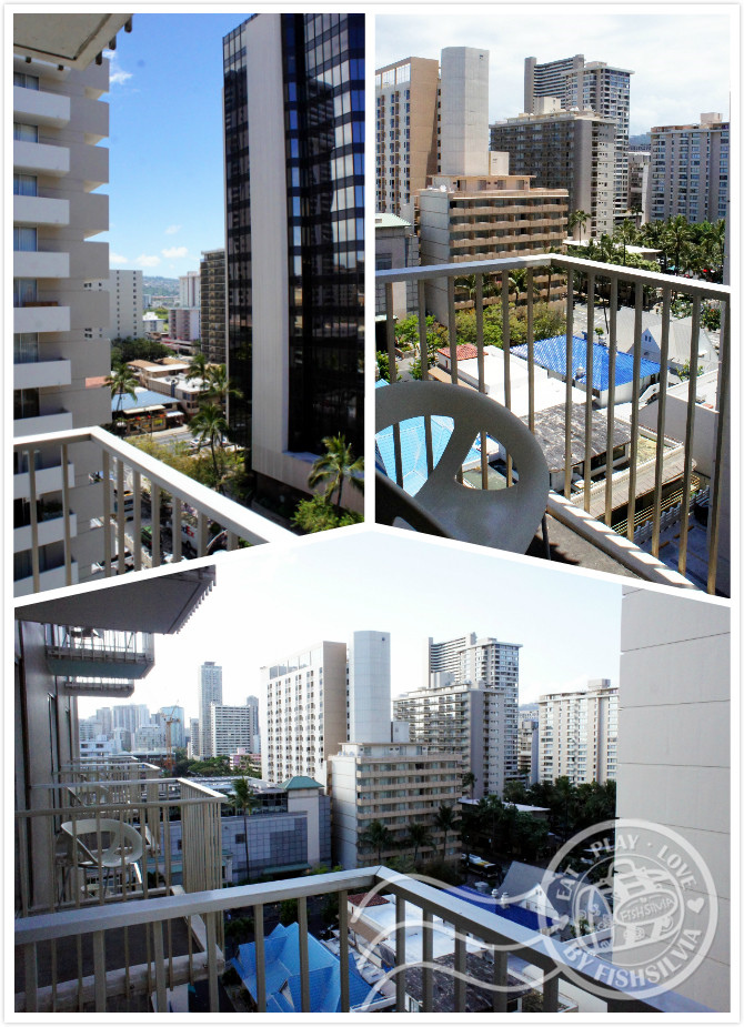 雖然說同樣的房型格局大小本來就差不到哪裡去,但至少窗外的一切就顯得舒服許多呀!站上露台還能看看Waikiki著名的天際線,每天早上起床望向夾縫中的藍天都猴嗨森啊!!