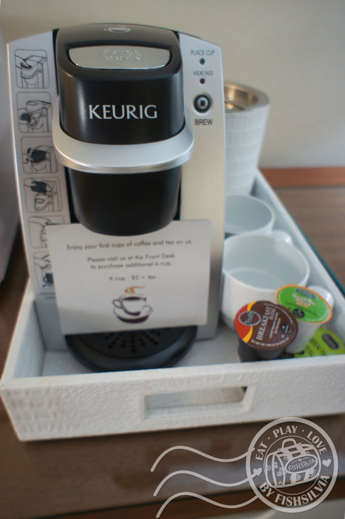 平價小旅店也是可以趕搭膠囊咖啡風,KEURIG咖啡機一擺,整個都上流起來了~不過上流歸上流,喝一杯記得要付錢,K-cup一顆兩鎂稅外加唷!