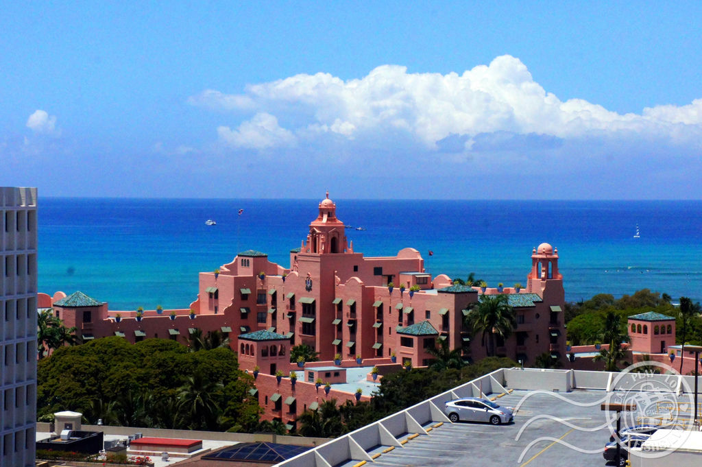 再拉近一點看,沒錯啊!就是赫赫有名的粉紅色皇宮THE ROYAL HAWAIIAN, A LUXURY COLLECTION RESORT(欸你名字也太長了吧