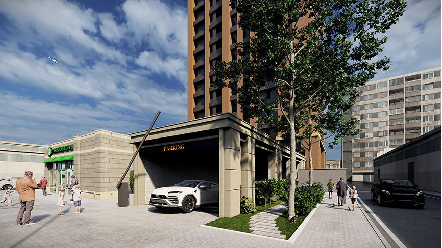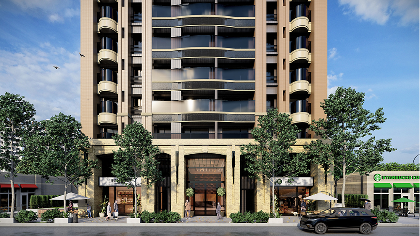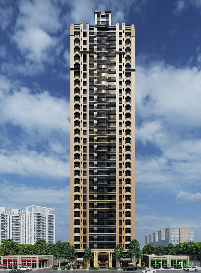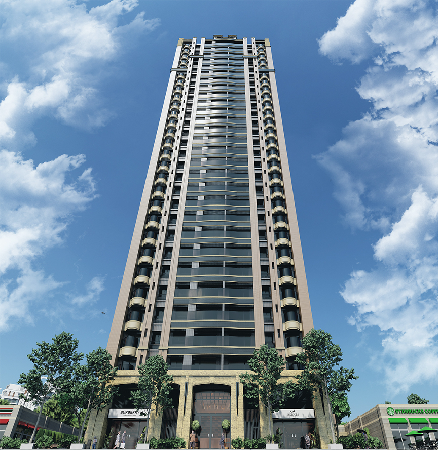建案位處熱鬧的市中心區段,為達到美化都市目的,在土地有限的情況下將一樓綠化空間予住戶及周邊居民共享,垂直的柱列除了為建築帶來恢宏的氣勢,亦能達到遮陽、調節溫度的效果。為提升住戶的休閒品質,在屋突層另設置一處綠化空間。本建案為一層四戶,結構配置讓每戶都能在保有隱私的情況下有二面開闊的採光,深凹窗的設計方式則讓採光只留舒適卻不會感到炎熱。