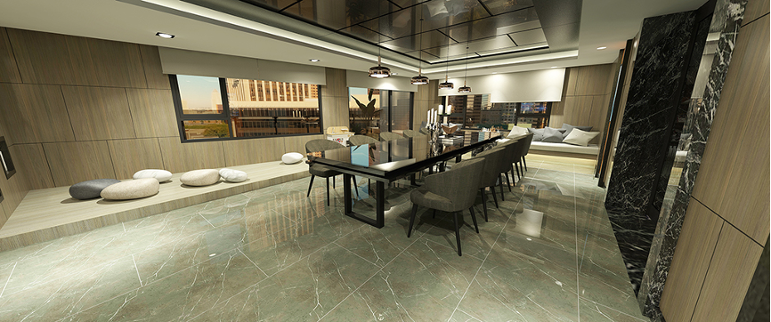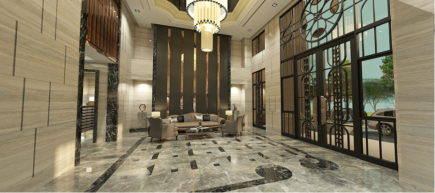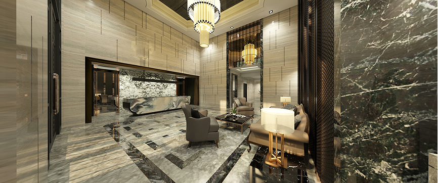 大門以透明玻璃為主,搭配部分茶金色玻璃與鐵件,形塑圓潤的麥穗造型,富有安居樂業的象徵。接待櫃檯行雲流水的石材紋理為空間增添清雅高貴之氣;古典語彙的天花造型與華麗的水晶燈相呼應,為偌大的空間定調視覺中心。