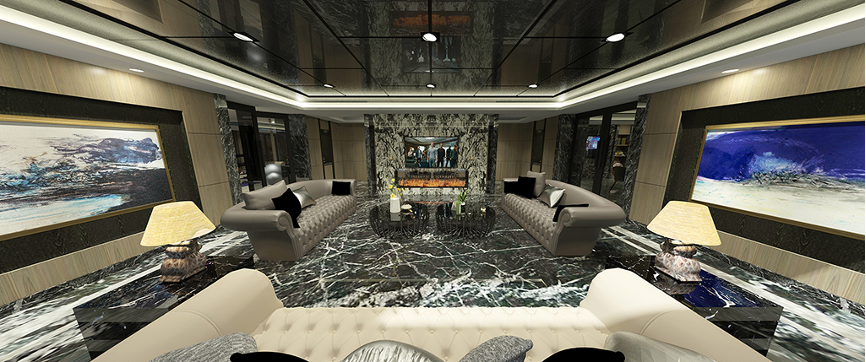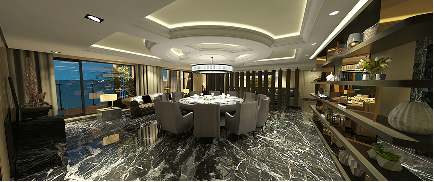 多功能宴會廳裡除了有大圓餐桌外,也有沙發區與吧檯區,提供住戶與賓客不同場合使用。設計師巧妙運用隔屏與展示架達到分界目的。多功能宴會廳裡的圓弧形天花、落地窗與水晶燈沿用大廳風格,除了讓室外光線充分進駐,也讓兩個空間的整體視覺、氛圍一致。多媒體影音室中兩幅油畫搭配大理石地板與電視牆讓磅礴氣勢展現於無形。電視牆下的暖爐不僅有點綴效果,同時也有暖氣功能調節室內溫度,避免因使用石材的緣故流失熱能。