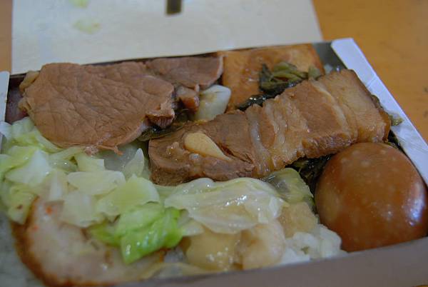 打開香噴噴的飯盒,滷汁香氣瞬間散發開來,滿到看不到白飯是它的特色,內含爌肉、瘦肉片、豆干、滷蛋、青菜、黑輪、酸菜等,每一種配菜都滷得相當入味,自然甘甜而不死鹹,配上白飯真的恰恰好!