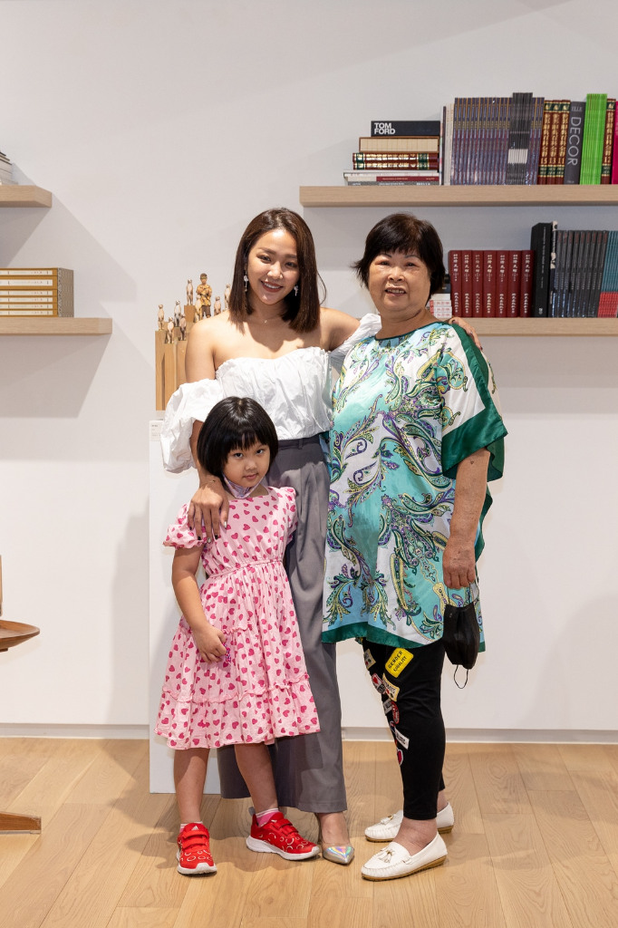 ▲ 賴慧如帶著阿嬤以及女兒恩恩出席藝術家江基名個展(浮生是夢)。(圖:寶吉祥集團)