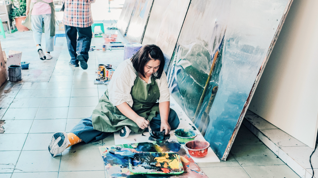 ▲ 鍾欣凌儘管腳麻,仍專注在作畫上。(圖:桂田文化藝術基金會)