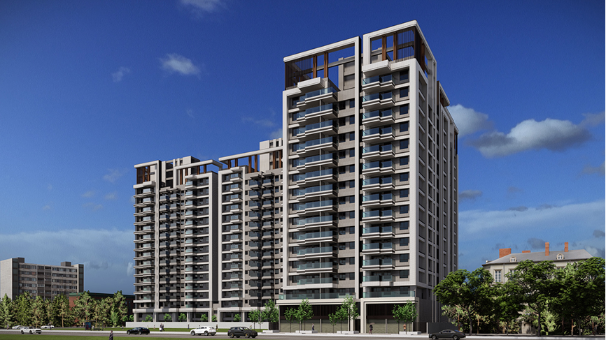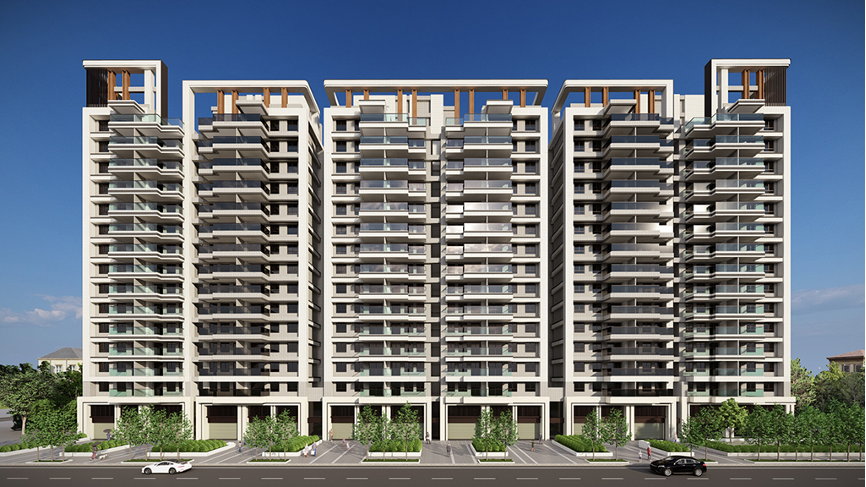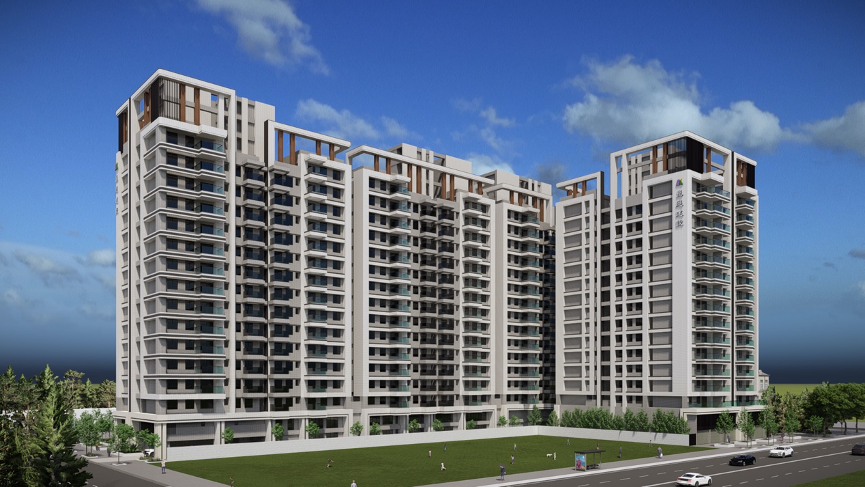 本案建築量體大尺度的退縮,利用退縮出的空地空間配置廣大的綠美化供往來民眾休憩使用。容積向上堆疊成高樓,更易讓周邊水系的藍、綠帶的綠引入居室內的視野。以簡約洗鍊的筆觸及運用原有機能造就建築線條,以韻律和色彩深淺交織虛實變化。