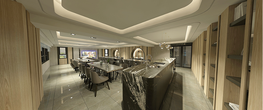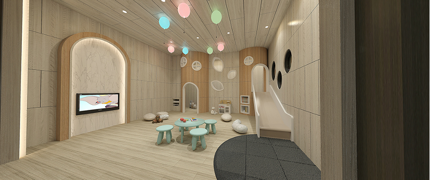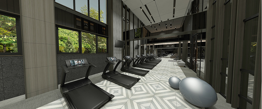 本大樓有豐富的公設空間,包含大廳、健身房、休閒遊戲室、多媒體影音室、多功能交誼室等,不僅具備實用與娛樂性,更是居民間聯絡感情的地方。甫入大廳,寬廣大器的空間配上沉穩的色系,加上典雅的同心圓吊燈,締造奢華且不落俗套的意象。多功能交誼室裡大理石製的餐桌及吧台搭配皮製的座椅,且皆採用同色系,營造和諧感。休閒遊戲室中黑大理石的電視牆配上跳色的橘綠配色,優雅而不失溫度。兒童遊戲室利用繽紛的色彩燈點綴,充滿溫馨童趣。邊角採用圓弧收邊提升柔和感,且能保護兒童遊戲時的安全。健身房挑高及長型的空間營造出廣闊感。窗外自然光引入室內,綠意景觀如同沐浴大自然之中。