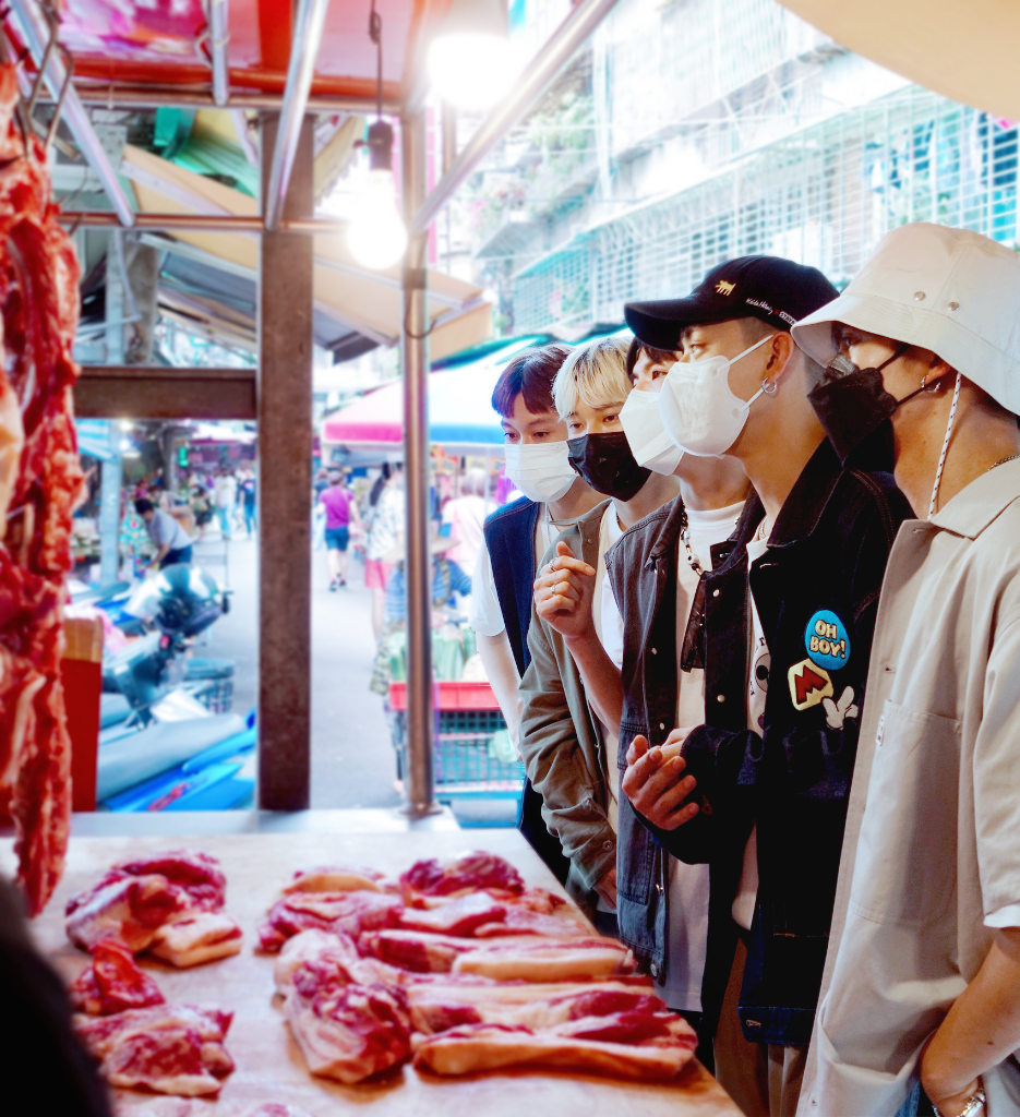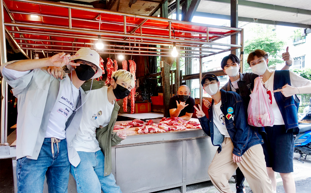既然要烤肉露營也得扛下採買任務,在有限預算下買夠食材餵飽所有同行團隊。市場裡,5個大男孩不惜跟豬肉攤老闆殺價,靠「親和力」博得同情,老闆體恤「年輕人打拚不容易」,讓ALL IN