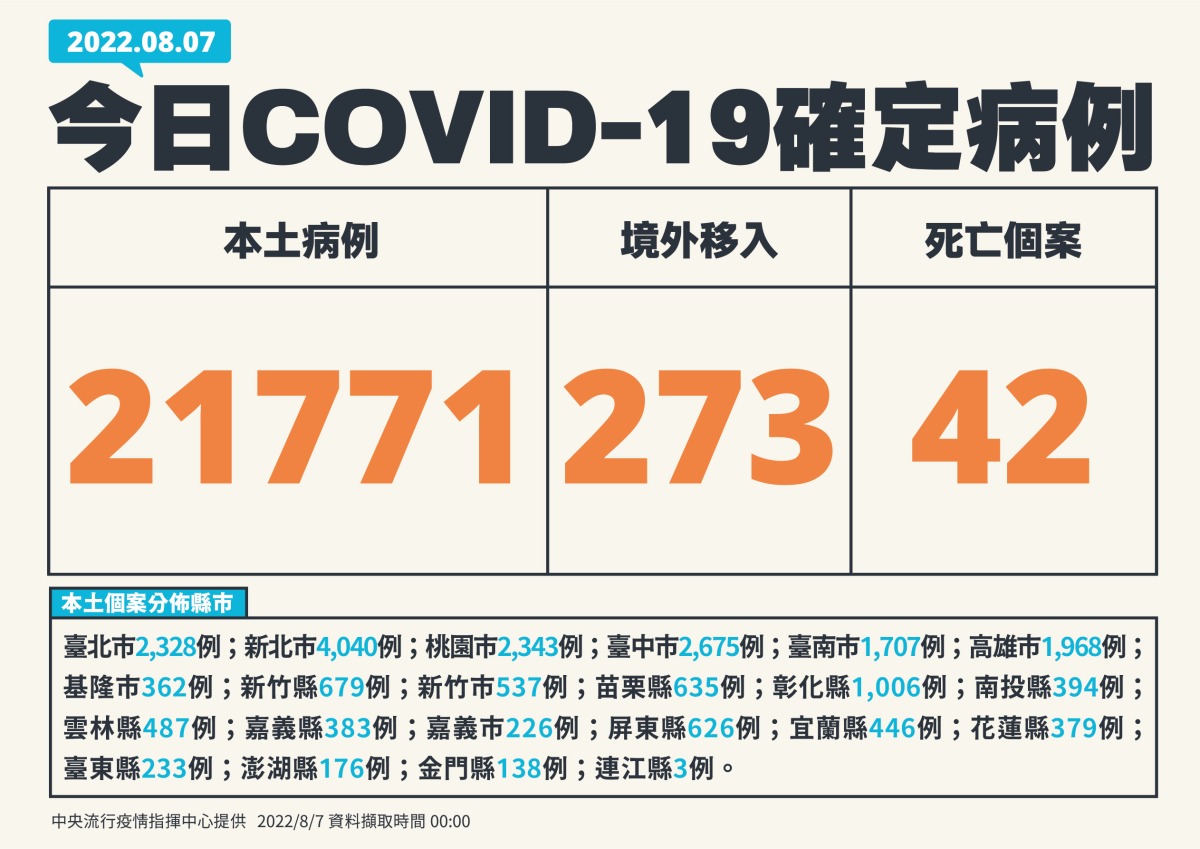 中央流行疫情指揮中心今(7)日公布國內新增22,044例COVID-19確定病例,分別為21,771例本土個案及273例境外移入;另確診個案中新增42例死亡。