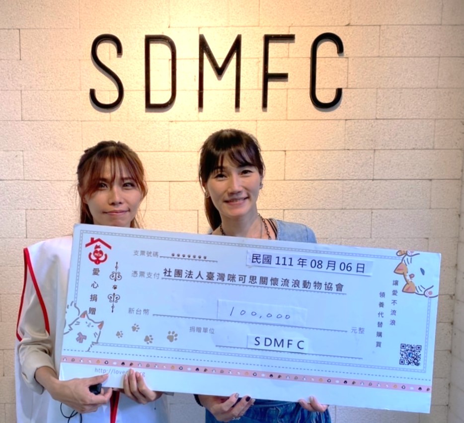 SDMFC不僅將二手服飾的所得捐贈於【動保‧處方籤】浪浪公益照護,力挺咪可思流浪貓中途之家以人道精神照顧浪貓,也發揮影響力召集iTinney浪浪洗澡志工,成為台北環保與動保的時尚新社群。現場更補助HolyPet寵物AI健檢服務,以人道精神提供毛孩無痛檢查,分析健康保養數據。