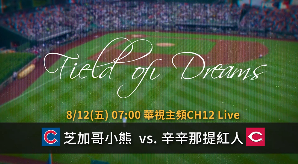 美國職棒大聯盟(MLB)一年一度的「夢田之戰」(The Field of Dreams Game) 將於台灣時間8月12日(週五)隆重登場,由芝加哥小熊隊對上辛辛那提紅人隊,華視主頻於上午7點開始轉播,由資深體育主播陳亞理播報,搭配專業球評陳子軒給觀眾最精彩的賽事轉播。