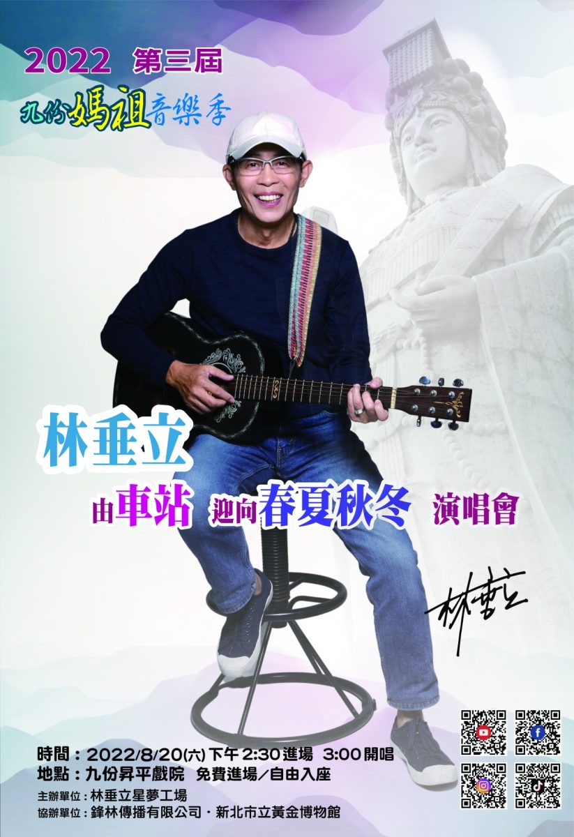 在新北市政府與黃金博物館支持下,原訂今(111)年5月7日於九份昇平戲院開唱的「2022年第三屆九份媽祖音樂季 林垂立由車站迎向春夏秋冬演唱會」因疫情延期辦理,在許多民眾殷殷期盼下,即將於8月20日下午3時在九份昇平戲院重新登場,這場以敬奉媽祖所辦理的演唱會,除了可欣賞〈車站〉與〈春夏秋冬〉創作者林垂立詮釋的一些經典創作外,也將發表林垂立新作品〈金瓜石〉,現場除免費進場外,因席次有限,演唱會將同步在林垂立臉書採線上直播,提供民眾多元管道欣賞表演。