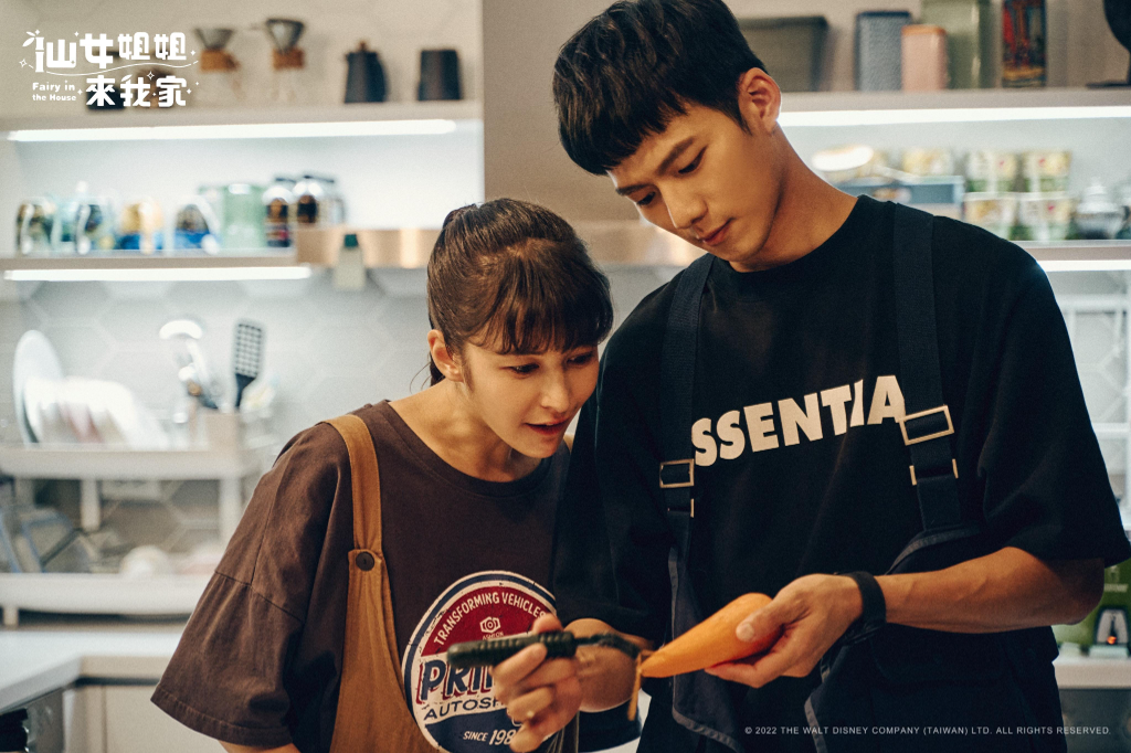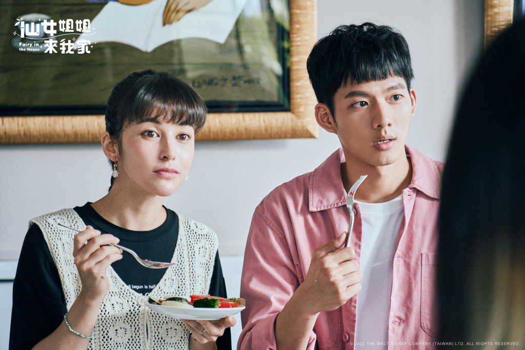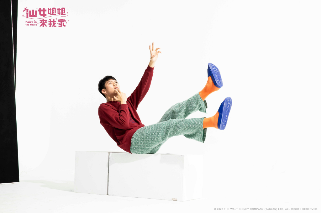 為了塑造出輕喜劇氛圍感,這次主視覺特別以輕鬆逗趣的構圖,呈現出仙女降臨凡間王家,一家人仰馬翻的創意動作,像是飾演王爸爸的尹昭德趣味掛在曬衣繩上;飾演王媽媽李之勤穿著家居服買菜;韓瑜、黃薇渟、李聿安三姊妹各自展現個性;還有吳念軒在空中懸浮深情望著仙女夏朧的模樣。為了完美呈現導演要求的空中飄浮感,吳念軒不僅自己發想動作,挑戰高難度僅用屁股支撐在箱子上,空中拉長雙腿,整個人看起來就是個標準C字型,每次拍攝時間長達5秒以上不能動,還要拍好幾次調整表情和動作,看起來輕鬆寫意,大秀核心肌群好腰力,一旁工作人員都讚譽有加。