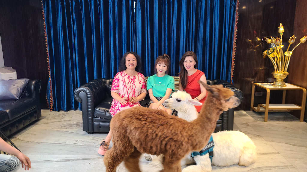 寵物星球頻道久聞大名,特別到現場拜訪,一腳踩進都市版的動物森友會。除了兩隻羊駝、兩隻迷驢之外,現場還看到兩隻長耳兔、三隻食蟻獸、四隻水豚君、一隻兔豚,還有一隻吉娃娃、一隻貓。王宥忻開心分享:「看到動物就覺得很開心,好像感覺我家裡面有很多家人,大家很快樂地聚在一起。」
