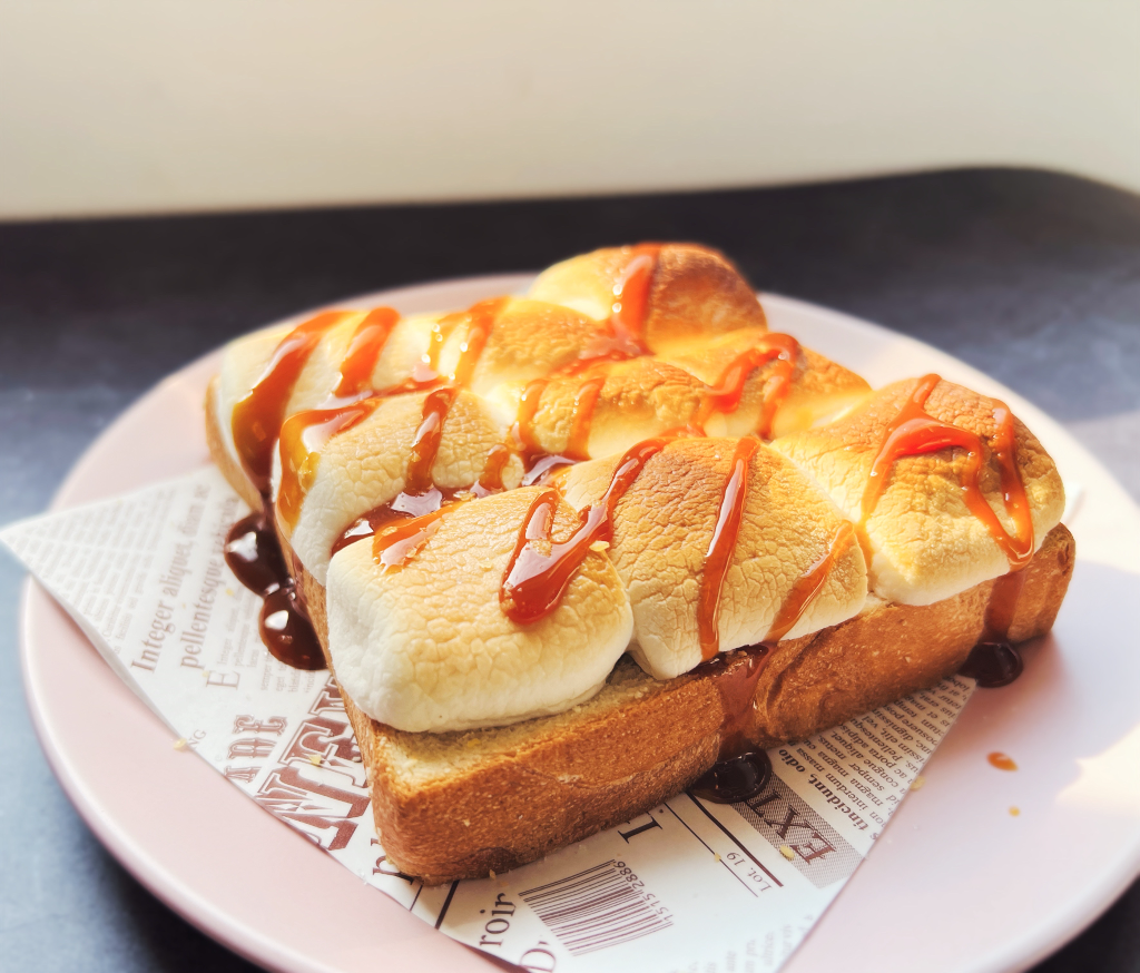 陳謙文表示,「這一次沛恩姐請我發想必可蜜的輕食系列,我就說嘗試鹹的跟甜的各一種,花了很多時間在構思。」,甜食特地針對必可蜜的slogan 「生活有點苦,必須加點蜜」,陳謙文也認為現在人生活壓力比較大,上班族會需要一點更好喝的飲料、吃好吃的甜食或是輕食來舒壓。所以這次就用了棉花糖加上了焦糖,最後再灑一點點跳跳糖,讓它變得豐富有趣一點。「所以在吃這個厚片吐司的時候,你就會有甜蜜、有牽絲、又有跳跳糖的一些爽脆感,希望帶給大家一種驚喜的感覺!」