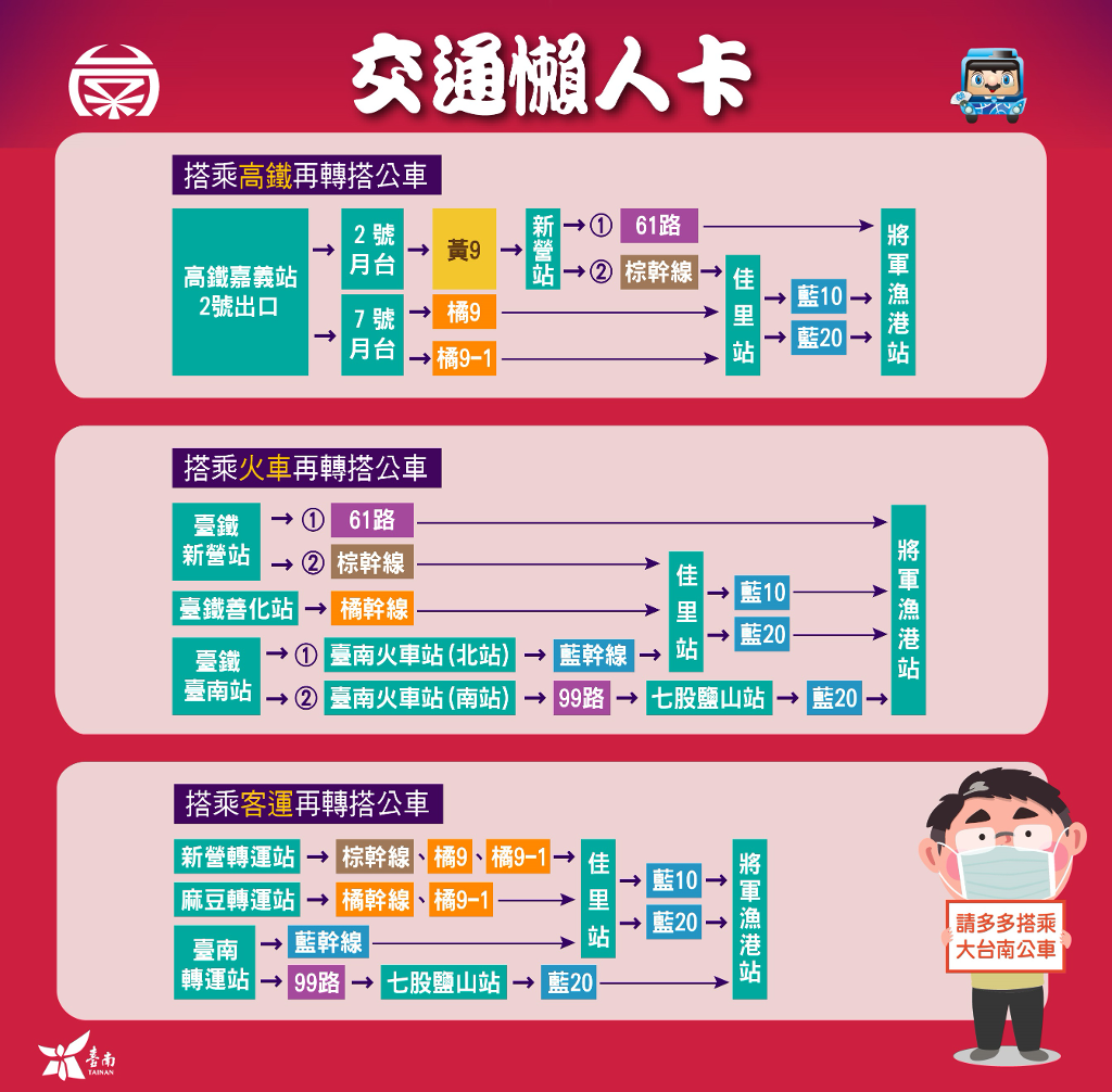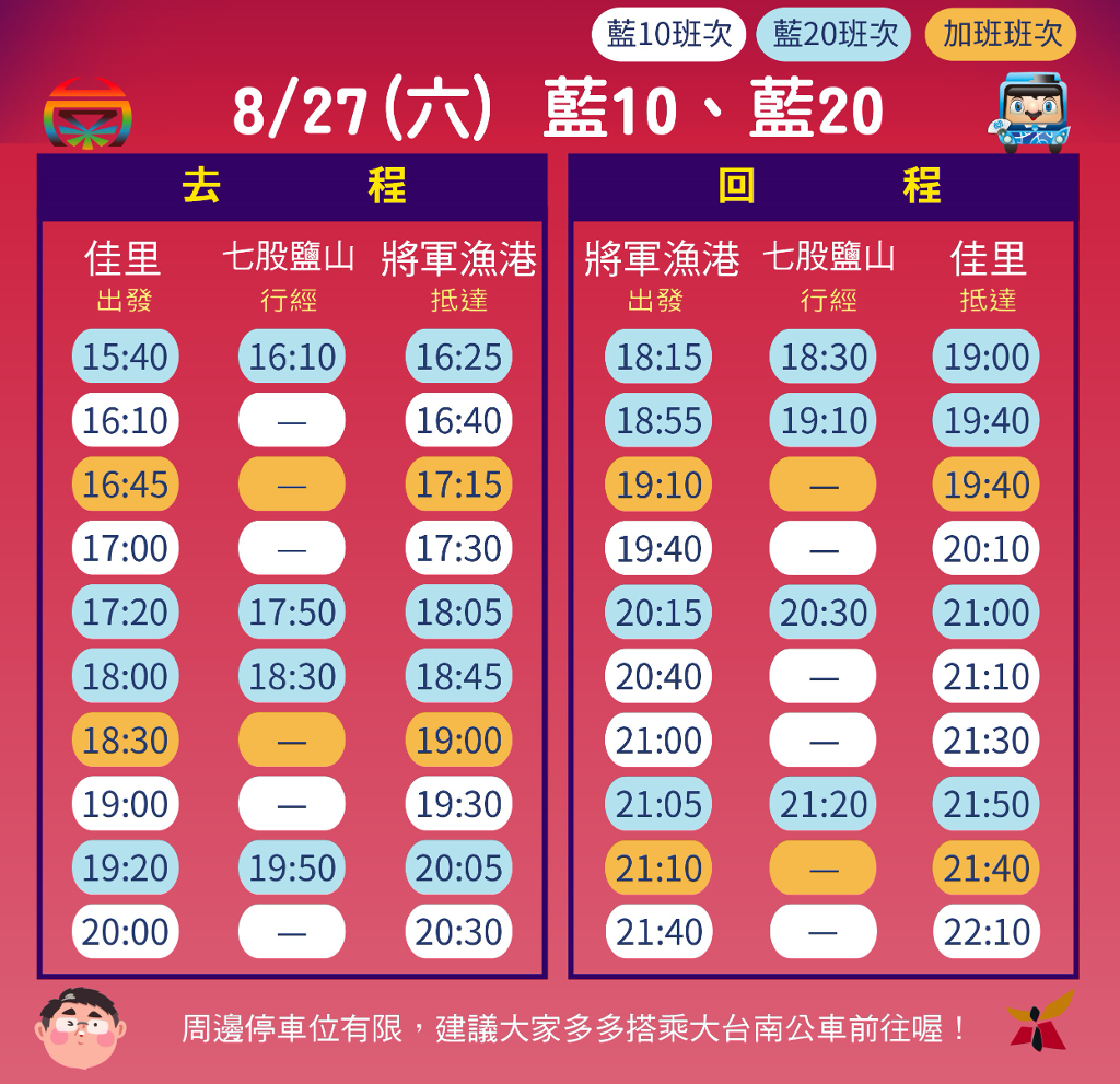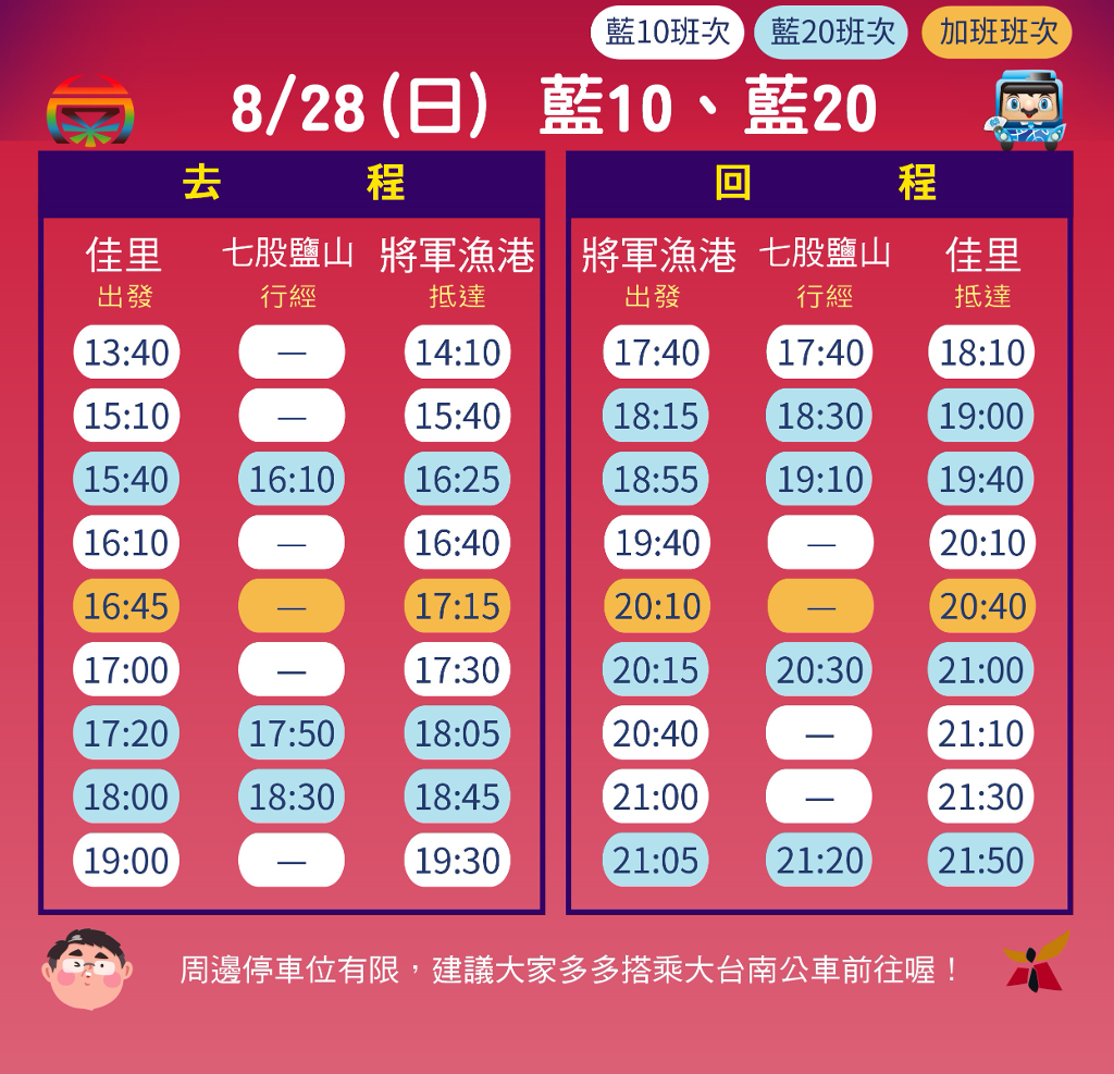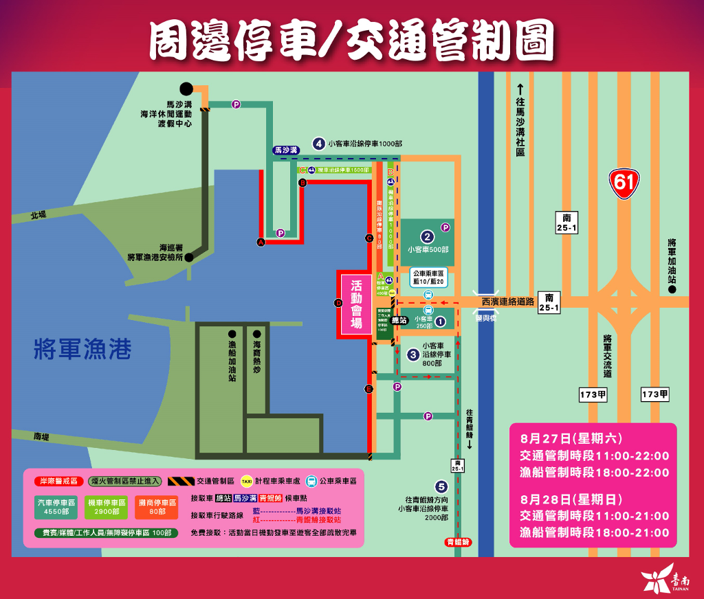 為配合演唱會及煙火施放活動,8/27(六)11:00-22:00、8/28(日)11:00-21:00臺南市政府將視將軍漁港周邊交通狀況,實施彈性車輛通行管制,籲請民眾避開管制時段,並多加利用大眾運輸工具前往會場。